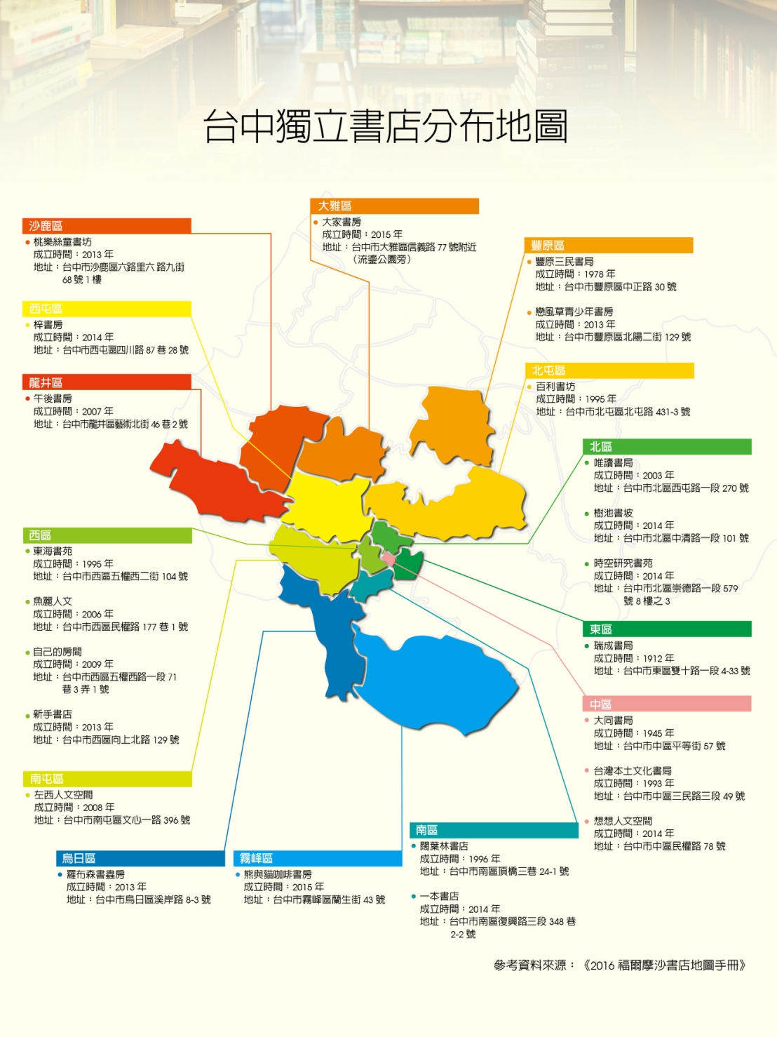 台中市目前已有超過23家獨立書店,展示書籍之餘,也提供咖啡、輕食、文創手作物等,並舉辦藝文活動邀請在地居民參與,以複合式經營帶動城市閱讀風氣;這些書店除展示書籍,在經營者對書店不同的想像與期待下,開創出不同的文化價值,豐富城市閱讀的多元型態。