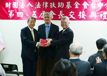 今日法律扶助基金會台中分會也舉行第4、5屆會長交接典禮,由卸任會長吳光陸將印信交給新任會長趙建興,並頒發紀念獎座,完成會務交接工作。