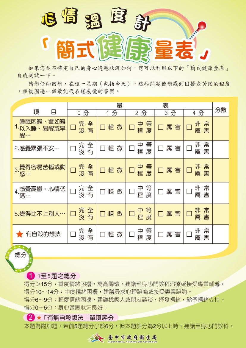 徐局長呼籲,民眾若只是想找人談談、討論問題或抒發情緒,可善用市府提供的免費定點心理諮詢,安心說出心裡的話;另平時亦可以透過心情溫度計了解自己的情緒,發現有情緒困擾問題時,建議撥打衛生福利部免費安心專線0800-788995(請幫幫 救救我),24小時都有專人傾聽。若您或親友感覺有情緒困擾或有憂鬱傾向者,可向各區衛生所預約洽詢( http://www.health.taichung.gov.tw/ct.asp?xItem=68820&ctNode=5024&mp=108010 ),相關訊息請上市府衛生局網站( http://www.health.taichung.gov.tw/ )最新消息查詢。(5/4*6)*衛生局