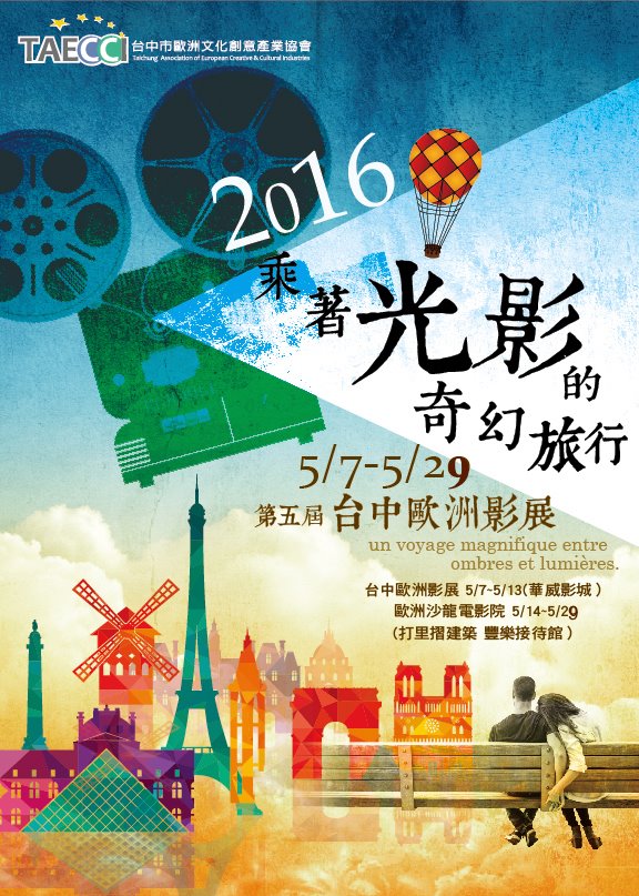 台中市「歐洲影展」週六(7日)起開跑!「乘著光影的奇幻旅行-2016台中第五屆歐洲影展」自5月7日至29日,精選14部法國、丹麥、義大利、芬蘭等國電影, 為期23天的歐洲影展活動,將分別在台中廣三SOGO 華威影城及打里摺建築豐樂接待館放映,影展及索票資訊可上臉書搜尋TARITSI ARCHI打里摺或上官網( https://goo.gl/UQxchJ  )查詢。