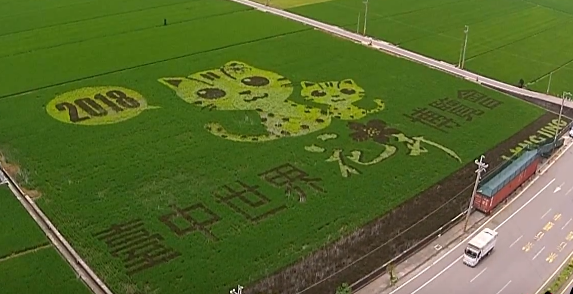 農業局表示,彩繪稻田面積1.2公頃,以花博吉祥物「石虎」及市花「山櫻花」構圖,運用白、綠、黃、紫等4種顏色稻秧編織成彩繪圖騰,歷經整地、劃線、設立座標、對圖、插秧、田間管理等過程,石虎圖騰已經成形。