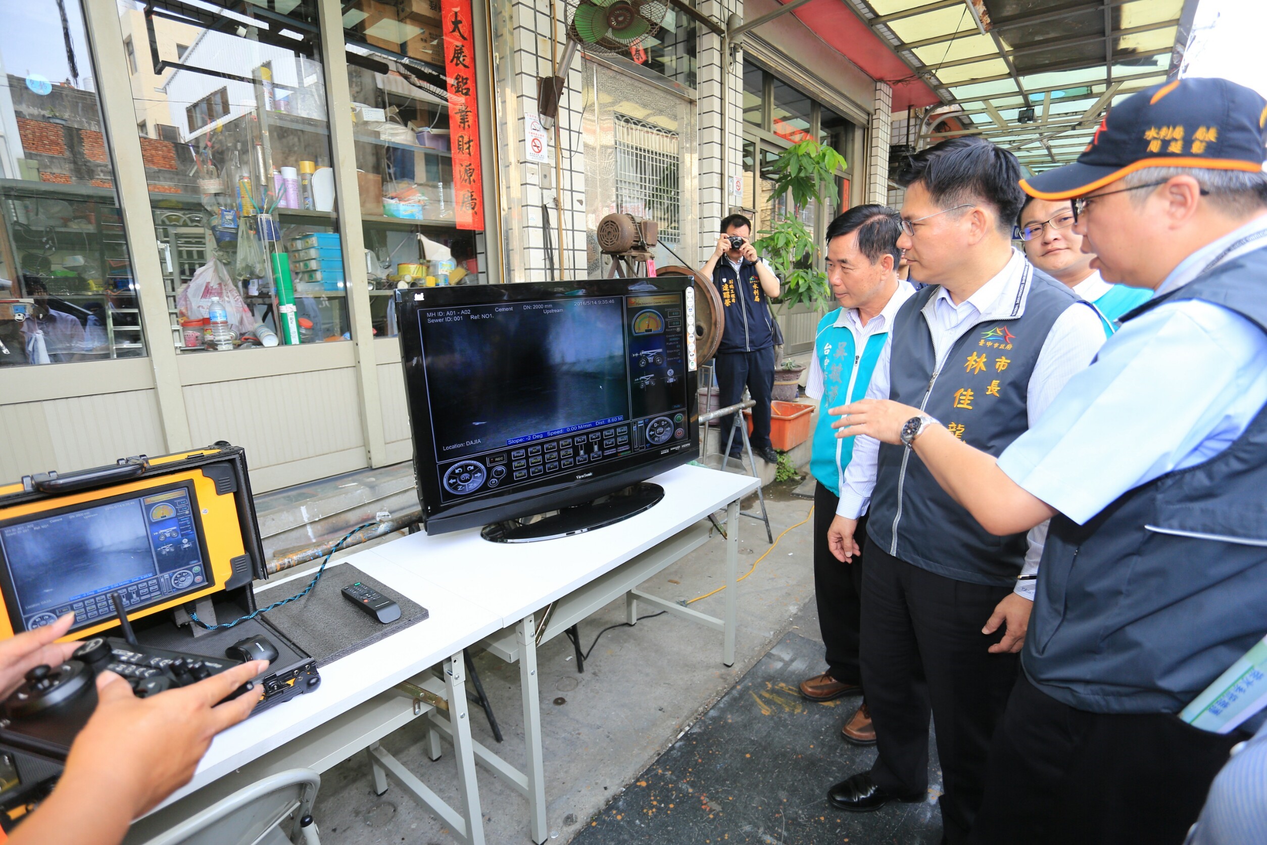汛期將屆,林市長今(14)日前往大甲區視察甲后路周邊排水改善工程,聽取水利局長周廷彰簡報,並實際操作俗稱「忍者龜」的地下道檢測機器人,查看截流箱涵內的排水情況。市議員吳敏濟、李榮鴻、林素真、大甲區長劉來旺以及多位里長也到場關心。