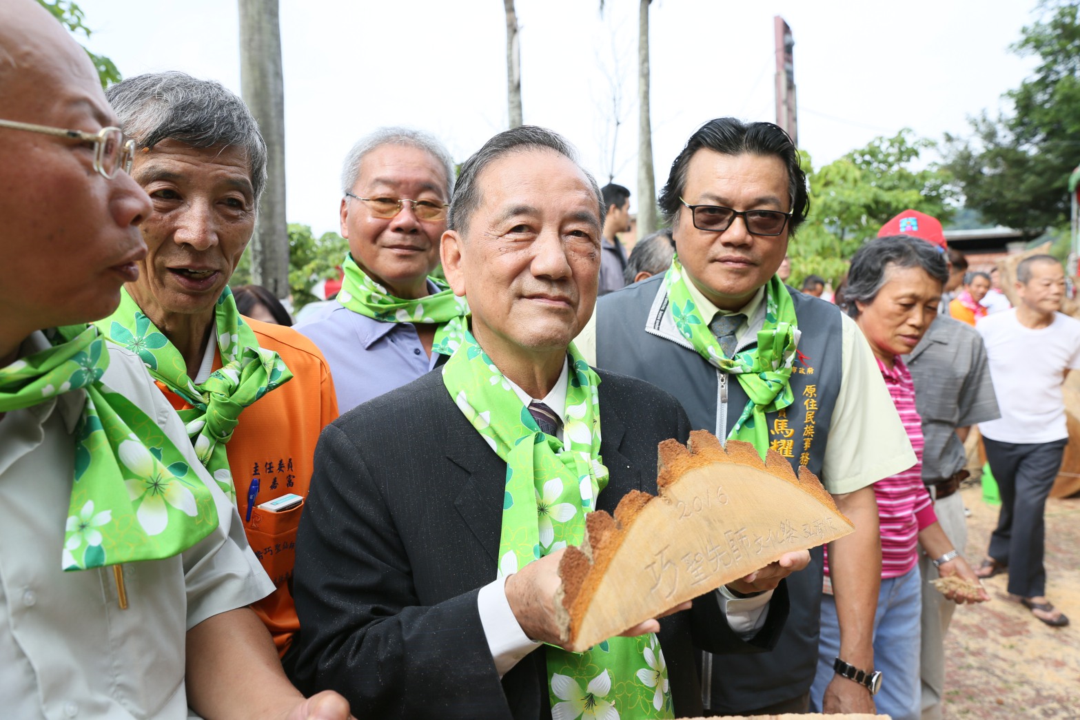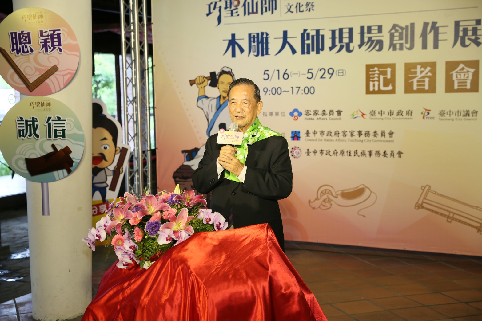 市府客家事務委員會今(16)日在東勢客家文化園區舉辦「木雕大師現場創作展」開展記者會,由林副市長、客委會主委劉宏基、原民會主委馬耀•谷木等人圍上客家花布,並拿著雕刻刀等機具進行起雕儀式,象徵活動開跑。