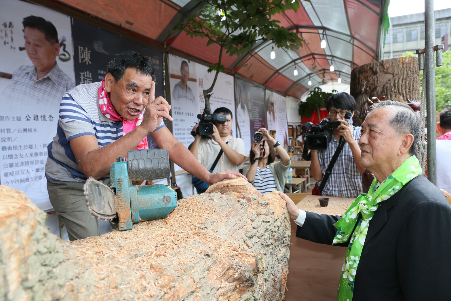 5位木雕大師也紛紛拿起電鋸、刻刀等工具,分別在至少175公分以上的台灣樟木上雕刻,現場飄散著濃濃樟木香,大師熟練的身手,都讓圍觀的民眾讚嘆不已。