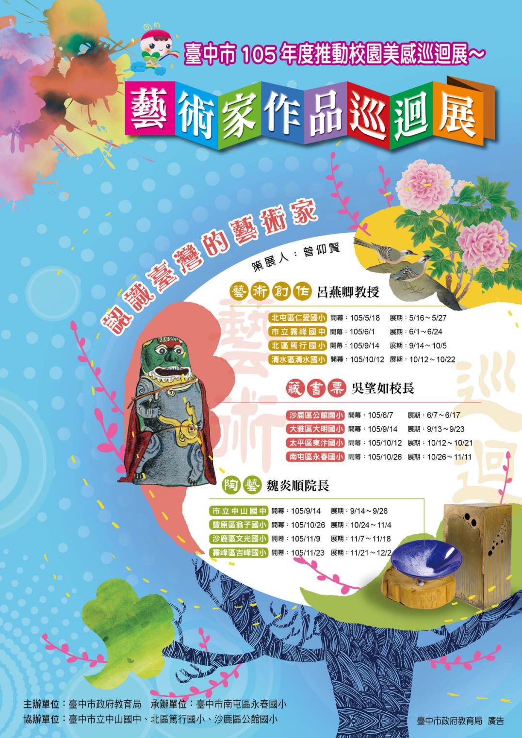 本次展覽由呂燕卿教授的「藝術創作巡迴展」揭開序幕,呂教授提供精選作品20餘件,即日起將依序在北屯區仁愛國小、市立霧峰國中、北區篤行國小與清水區清水國小等四校展出;吳望如校長的作品將在沙鹿區公館國小、大雅區大明國小、太平區東汴國小、南屯區永春國小展出;魏炎順院長的作品則會在市立中山國中、豐原區翁子國小、沙鹿區文光國小、霧峰區吉峰國小展出。(5/18*11)*教育局