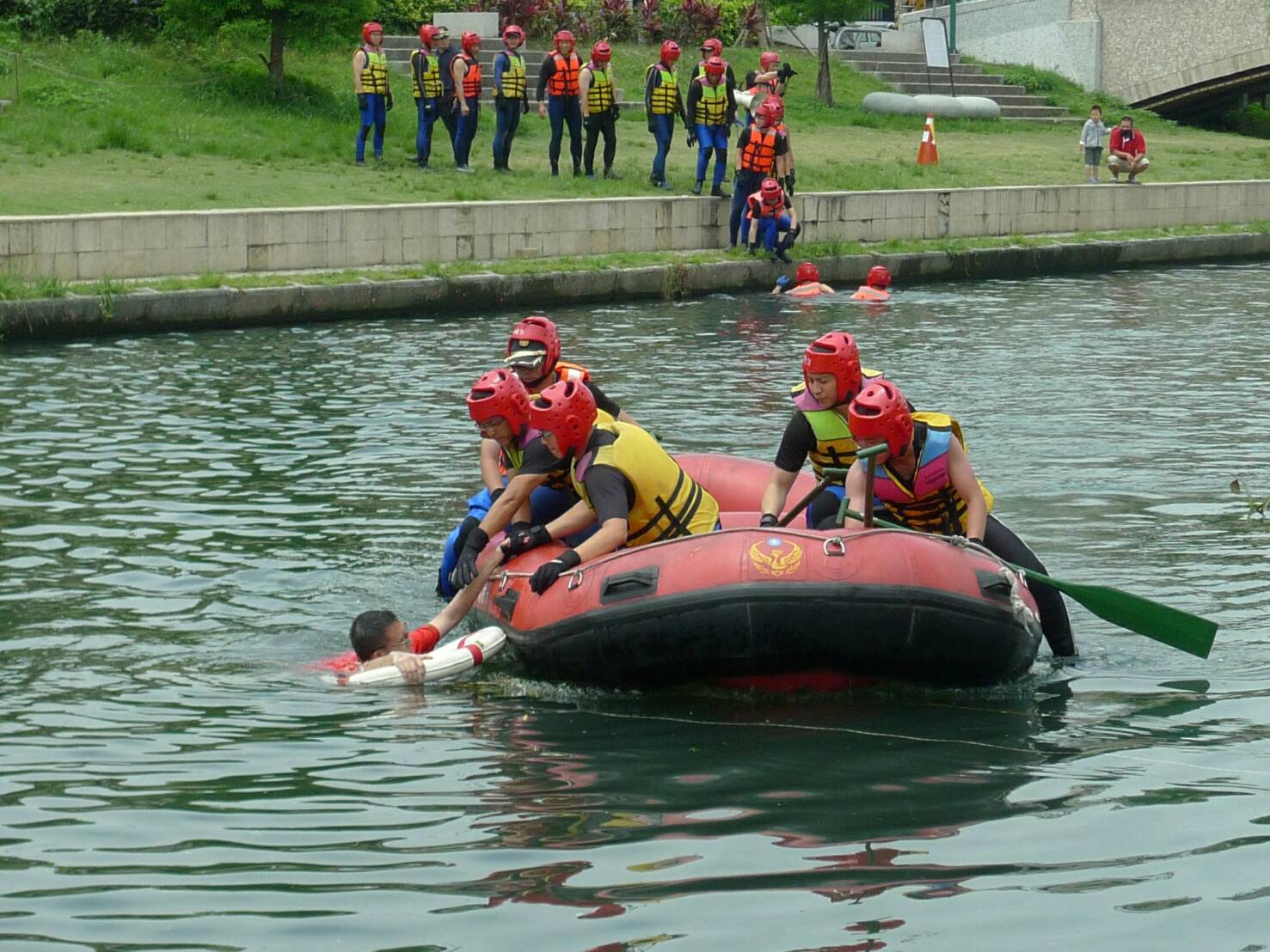 為持續強化消防人員水域救援的技能及應變能力,台中市政府消防局第七救災救護大隊今(18)日於旱溪環河路辦理水域救援演練,出動中港、中區、信義、勤工、東英及專責救護隊等六個分隊,計50人次參與,演練過程順利。