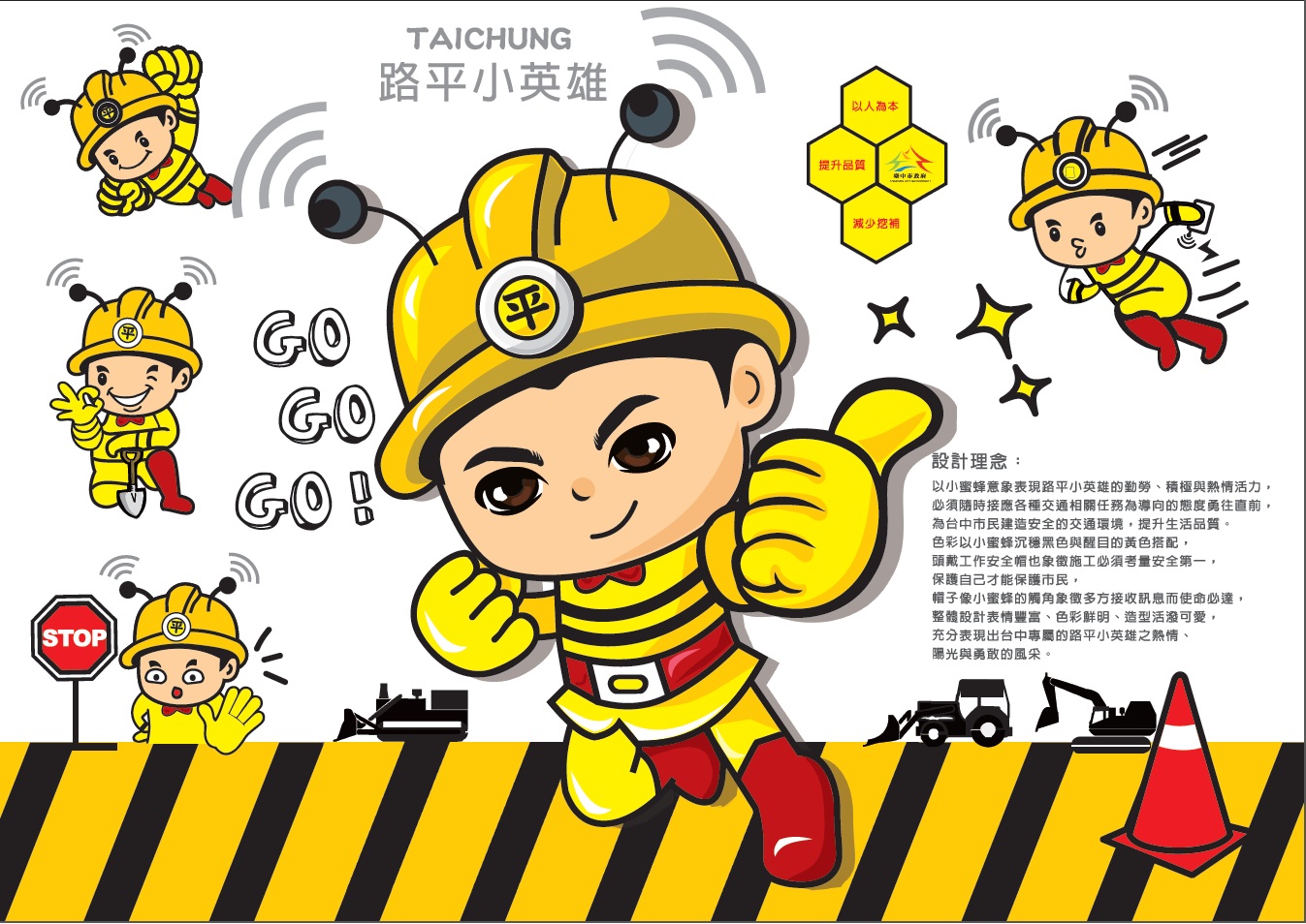 第一名得獎者謝欣錦說,「威蜂小尖兵」以小蜜蜂意象表現路平英雄的勤勞、積極與熱情活力,必須隨時接應各種交通相關任務而勇往直前,為台中市民建造安全的交通環境,提升生活品質。她指出,「威蜂小尖兵」以醒目的黑黃相間色彩,搭配安全帽設計,象徵施工必須考量安全第一,保護自己才能保護市民,而帽子上的小蜜蜂觸角,象徵路平人員隨時接收到「臺中好好行APP」或市府1999專線等多方訊息後,將會立即到場修補路面、把路鋪平。(5/19*7)*建設局