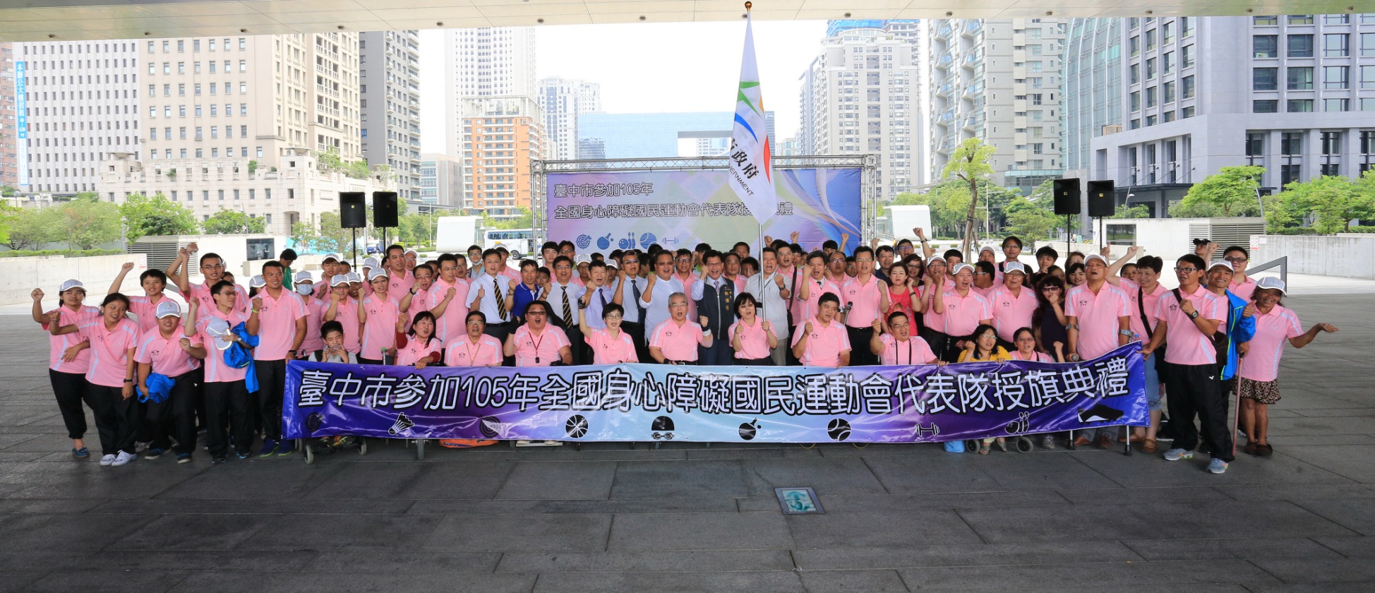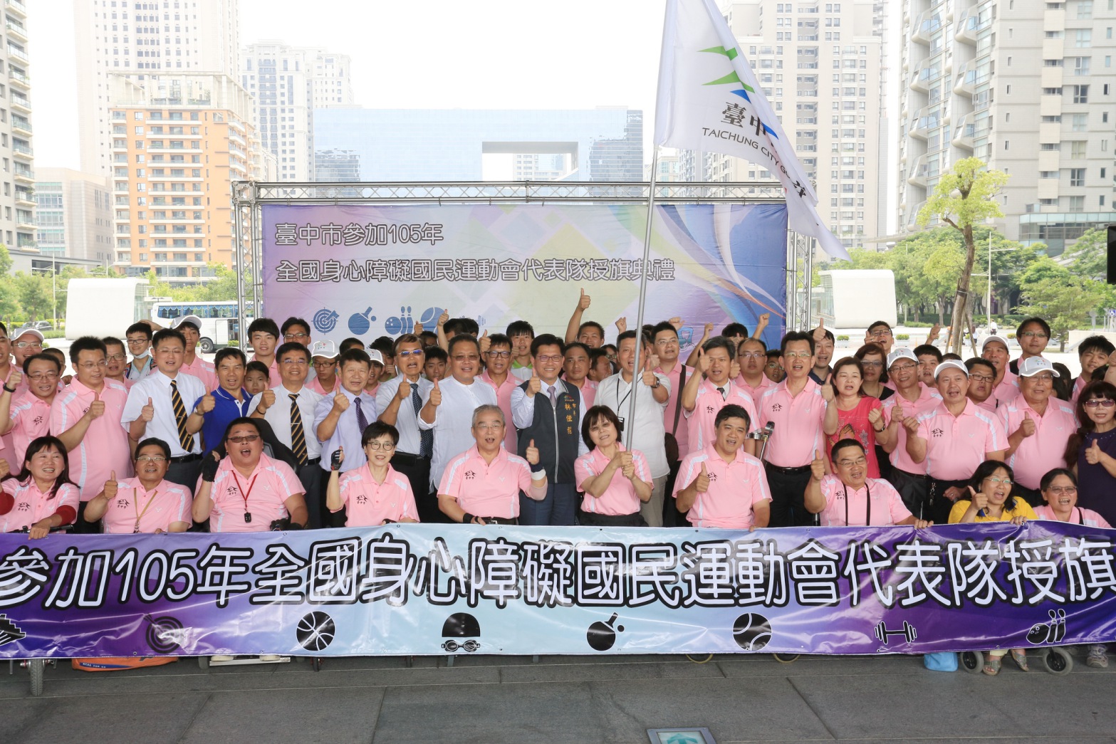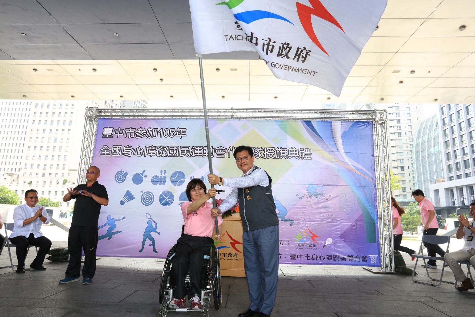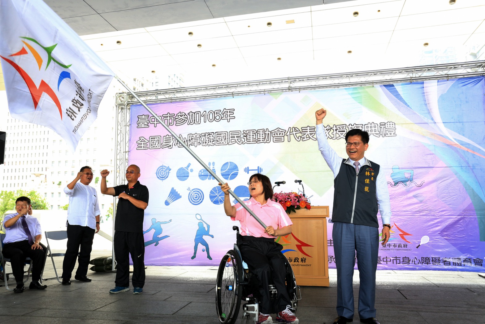 105年全國身心障礙國民運動會5月26日至29日在苗栗登場,台中市長林佳龍今(19)日在台灣大道市政大樓為台中市代表隊授旗,並由世界排名第7名的桌球帕運選手魏美惠代表接旗,林市長勉勵所有選手挑戰自我、克服障礙,今年再創佳績,爭取全國獎牌數第一名的榮耀。