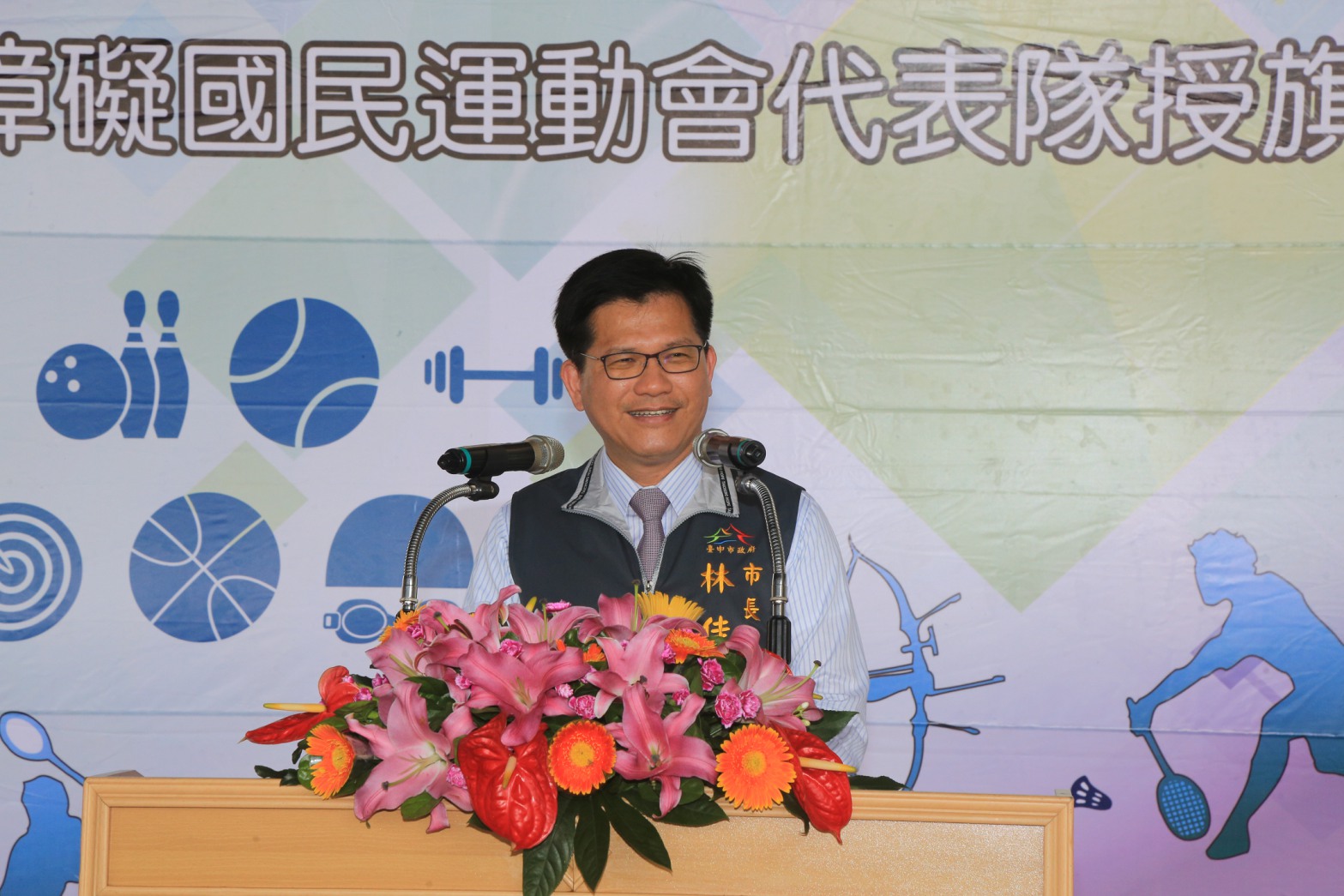 台中市代表隊今年派出208名選手、109名教練職員及43名隊本部服務人員出賽,預計將參加14項運動競賽,今日市長林佳龍在教育局長彭富源的陪同下出席授旗典禮,參議王岳彬、體育處長郭明洲及台中市身心障礙者體育會理事長陳成添、維他露基金會執行長侯至祥等貴賓也共同與會,氣氛熱鬧,選手士氣高昂。