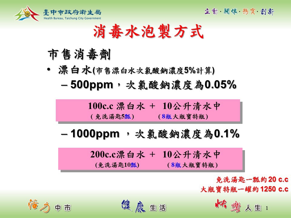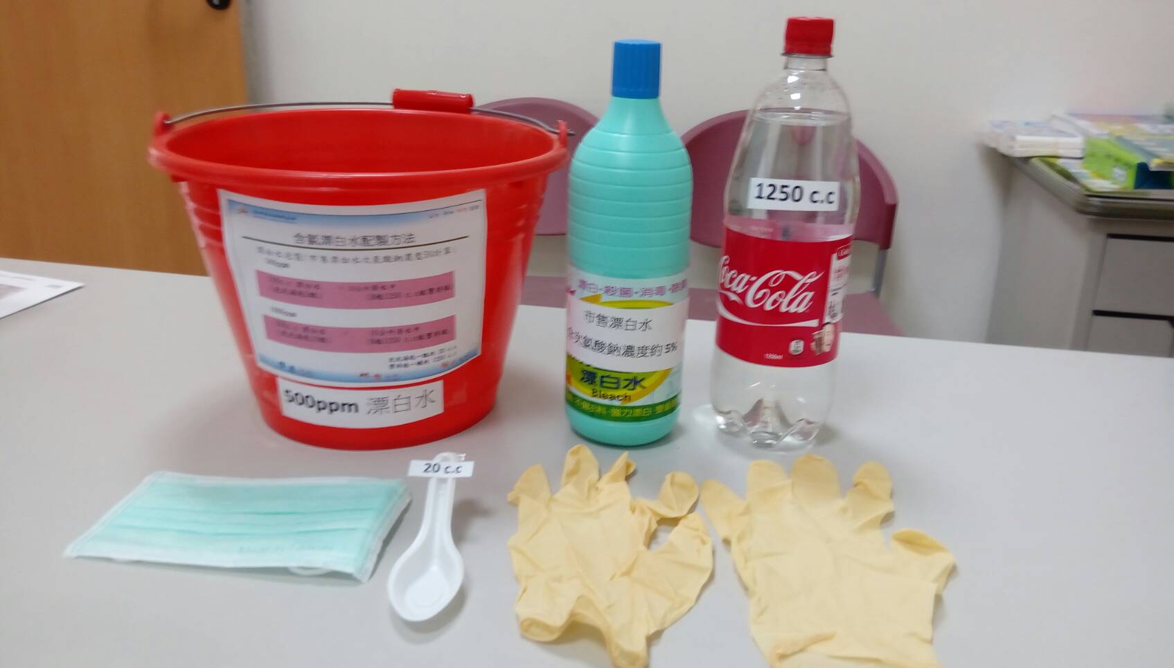 衛生局指出,漂白水是一種居家消毒劑,主要成分為次氯酸鈉,能使微生物的蛋白質變性,殺滅細菌和病毒,便宜又有效;市售漂白水濃度約5-6%,要調製成腸病毒環境消毒所需濃度為500ppm的漂白水,建議在水桶中加入10公升清水,再加入100cc漂白水,攪拌均勻後以擦拭方式進行消毒。