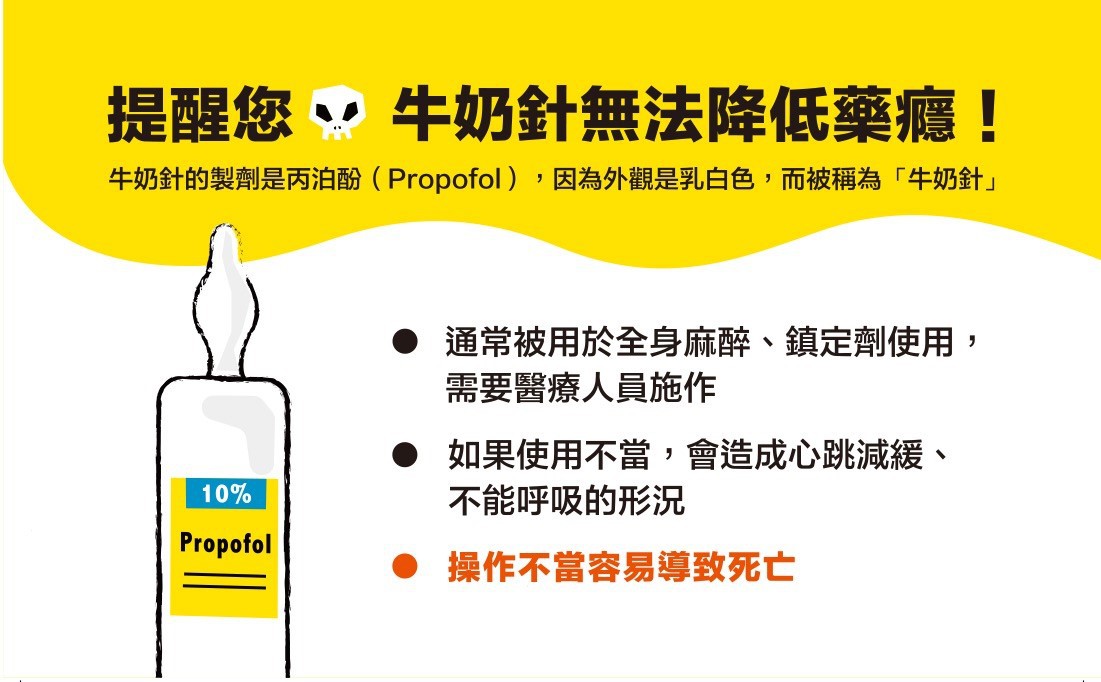 為深入了解靜脈注射藥癮者感染的原因,今年中央疾病管制署與市府衛生局在面訪多位新感染者後發現,部分藥癮者在出現戒斷症狀、又買不到毒品時,會濫用俗稱「牛奶針」的丙泊酚(Propofol)作為替代毒品,使用該毒品後會立刻昏睡,無法確定藥物是否會被他人取走繼續使用,此一不確定的風險,可能造成感染愛滋病毒的人數上升。