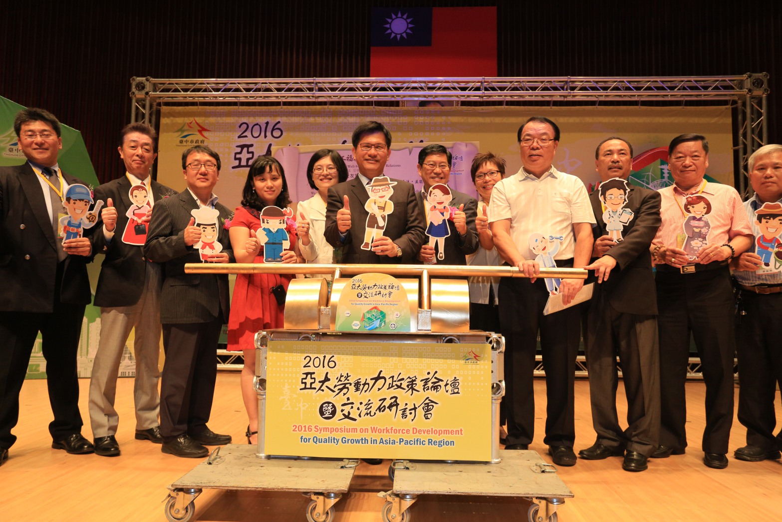市長林佳龍今日由市府勞工局長黃荷婷陪同,與APEC越南官方代表Nguyen Quynh Trang、新加坡職場安全和健康研究所執行長Gan Siok Lin、新加坡全國職工總會助理秘書長楊木光、南韓工會聯合會常務理事YOO Jungyup、日本勞動組合總連合會副事務局長安永貴夫、僱用對策局次長丸田満等人共同簽署「實現勞工福祉友好共識宣言」,並進行合作平台啟動儀式。中華民國全國總工會理事長陳瑞、台中市總工會理事長陳金源、台灣機械工會聯合會秘書長吳惠玲等人也都到場見證。