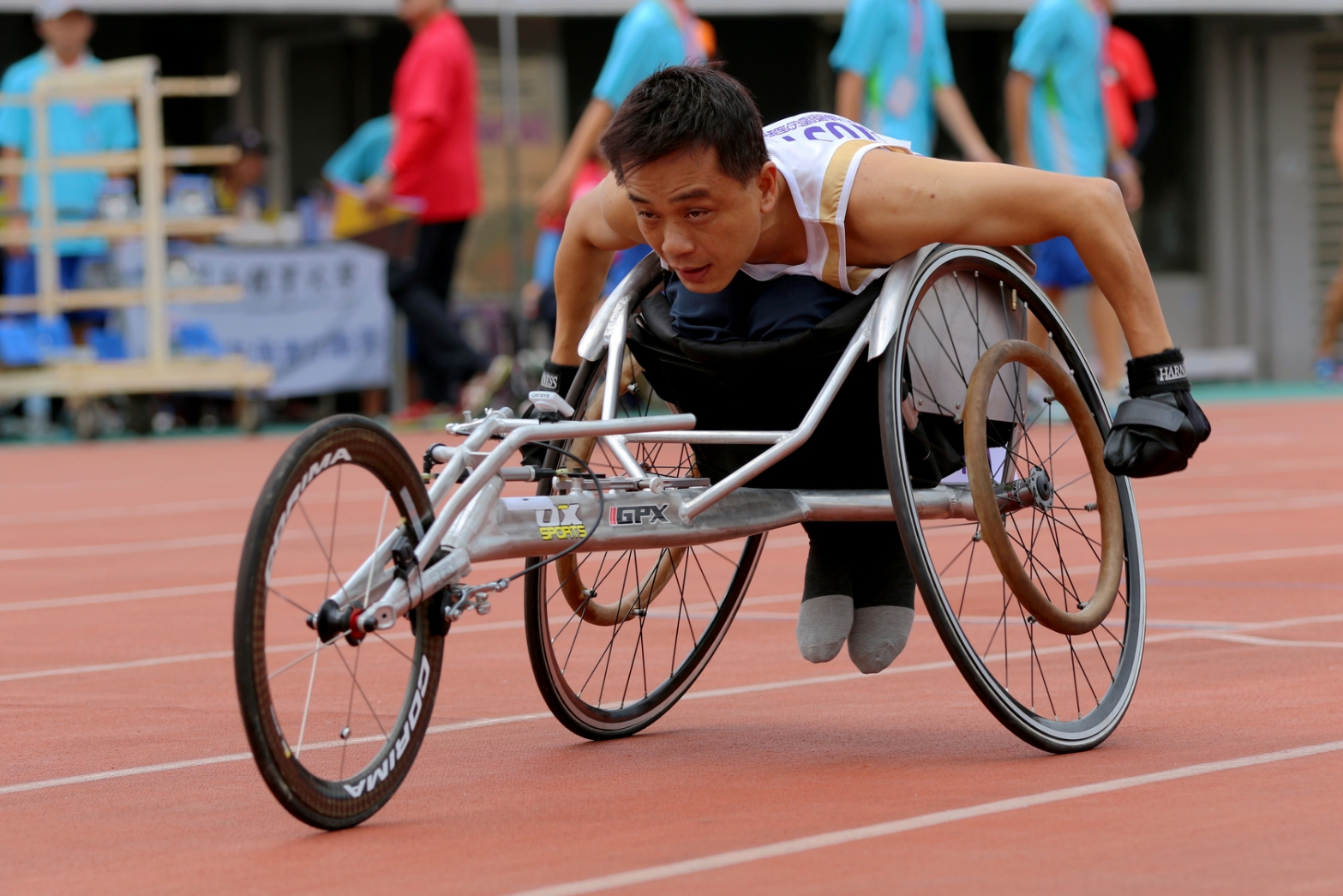 去年五月,林建宏托友人自日本購入價值19萬的專業競速輪椅,加上專業教練指導,並鍛鍊肌力、肌耐力,終於突破自我,展現優異成績,於200公尺以及鉛球、鐵餅、標槍項目都獲得冠軍並且打破全國紀錄。(5/30*17)*教育局