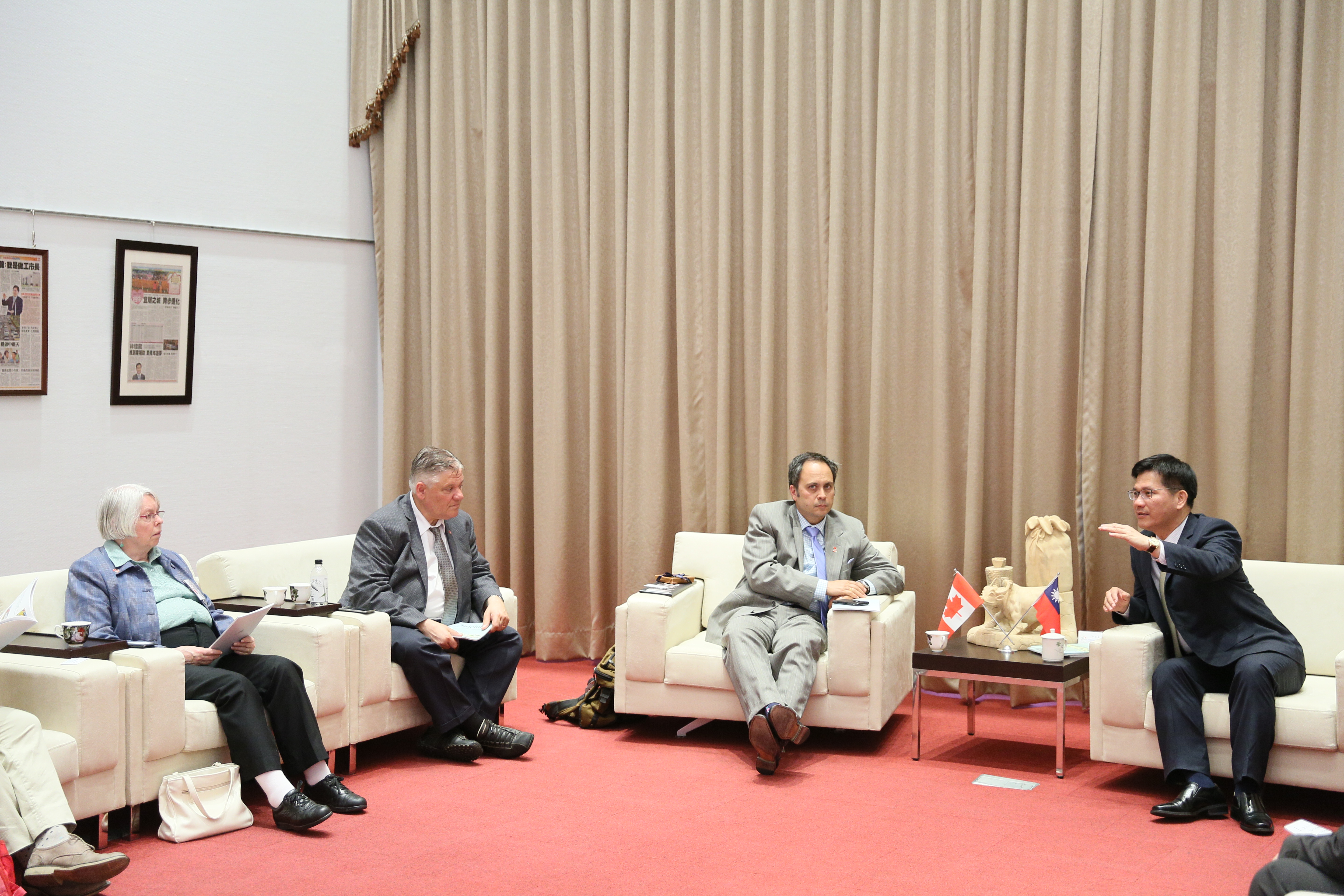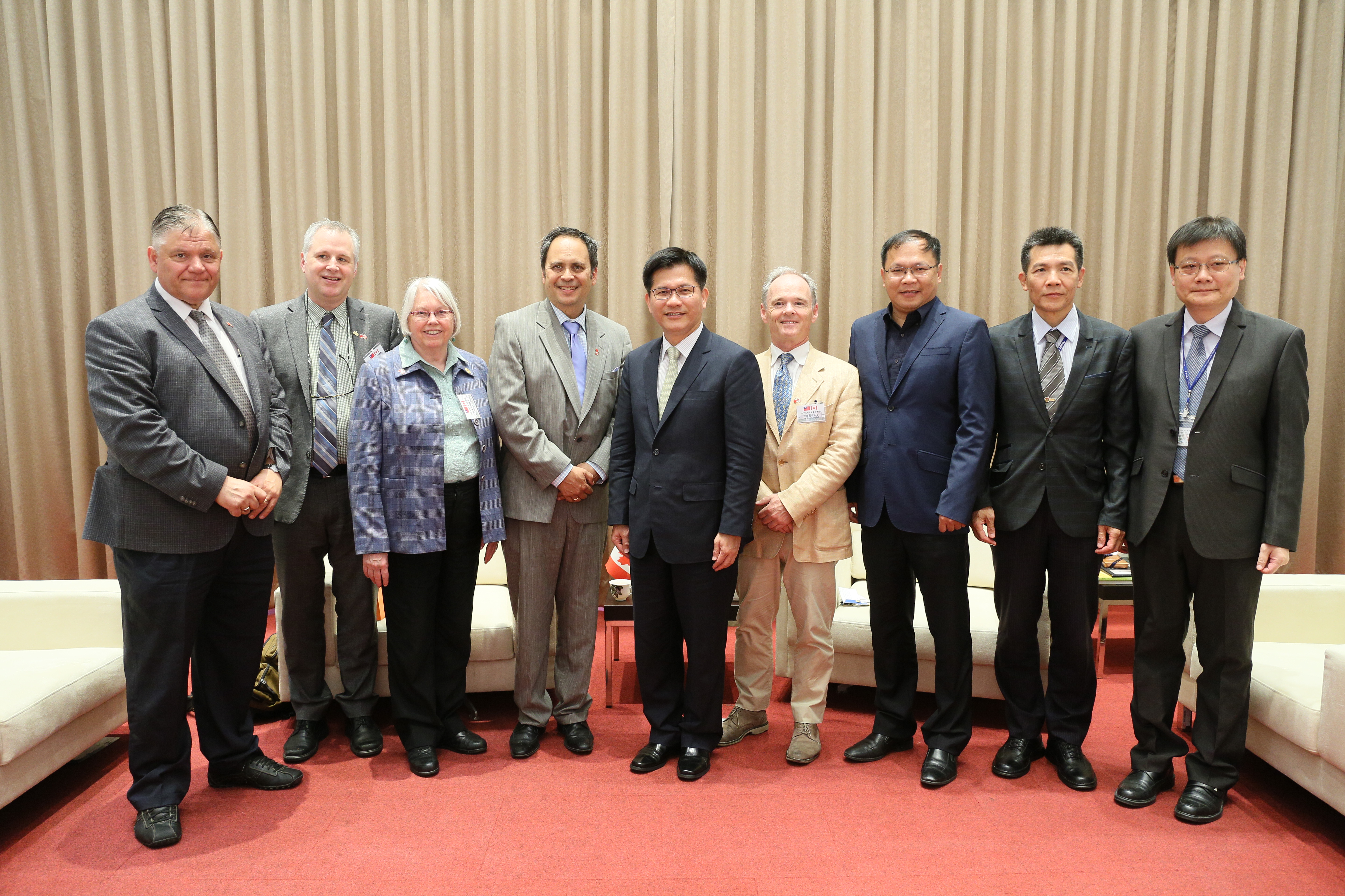 今日至市府拜會的加拿大一行人均是加拿大市級政要,包括多倫多市副市長Denzil Minnan-Wong及多倫多、渥太華、蒙特婁市等加國大城市議員,林市長則在交通局長王義川等人的陪同下與對方進行會談,雙方就科技發展、精密機械、捷運、經濟文化等面向進行交流,相談甚歡,氣氛愉快。
