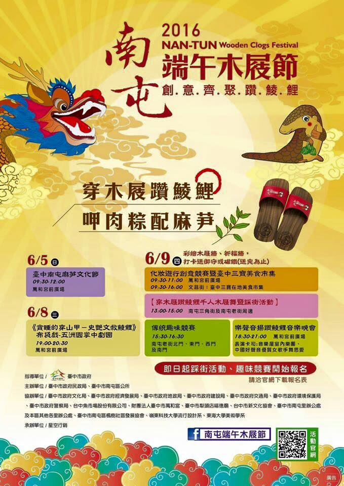 當天上午9時30分起,陸續有化妝遊行創意競賽、千人木屐舞踩街、鯪鯉打水仗、傳統趣味競賽及音樂晚會等精采節目,下午1時踩街活動將邀請木屐踢踏舞團和民眾共同跳起千人木屐舞!此外,市府還準備麻芛湯與肉粽品嚐,以及現場打卡送鯪鯉御守或鯪鯉磁鐵等精美紀念品,活動詳情可查詢(http://nantun2016.i-web.com.tw/ )或Facebook搜尋「南屯端午木屐節」,歡迎大家一起來「穿木屐躦鯪鲤、呷肉粽配麻芛」!