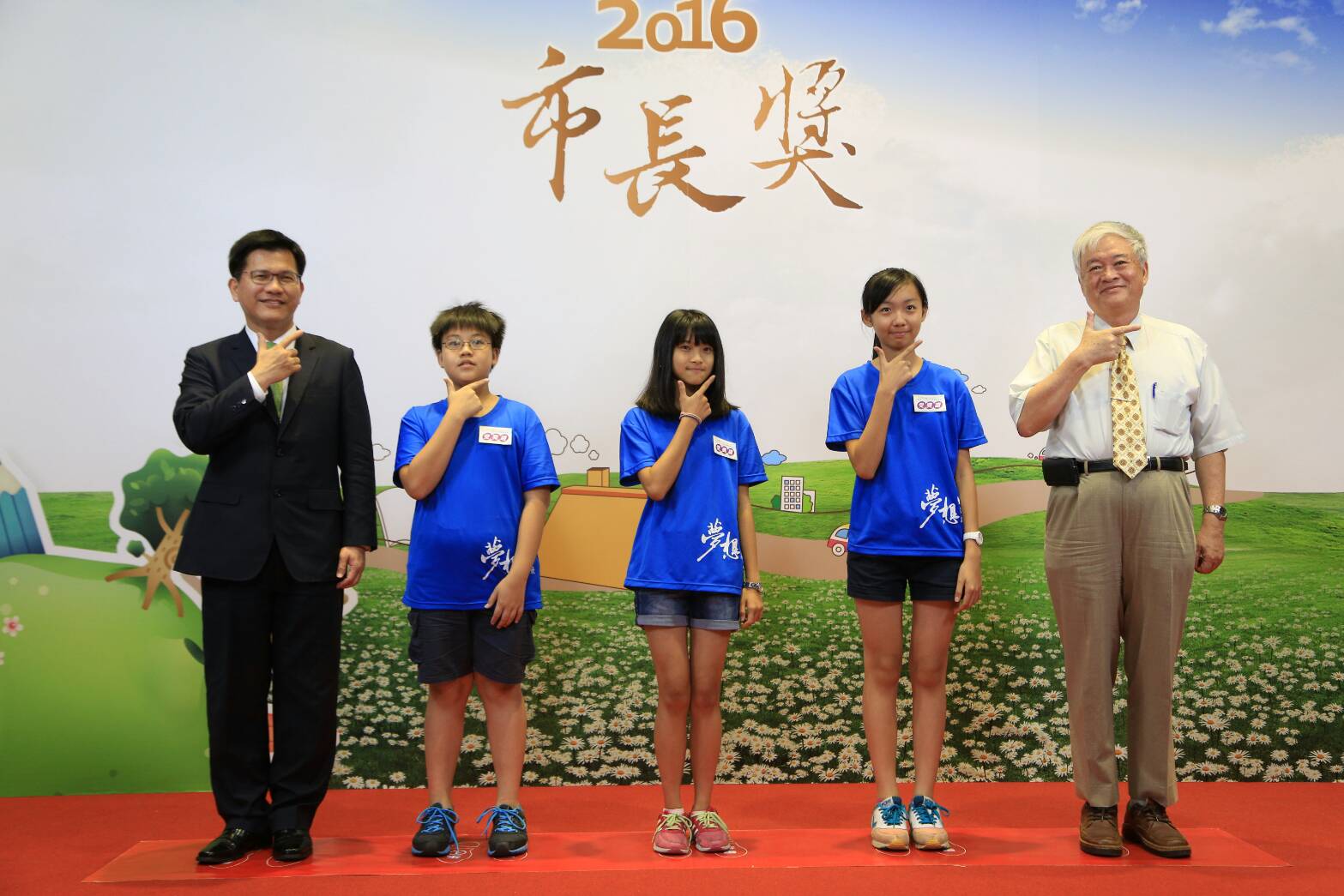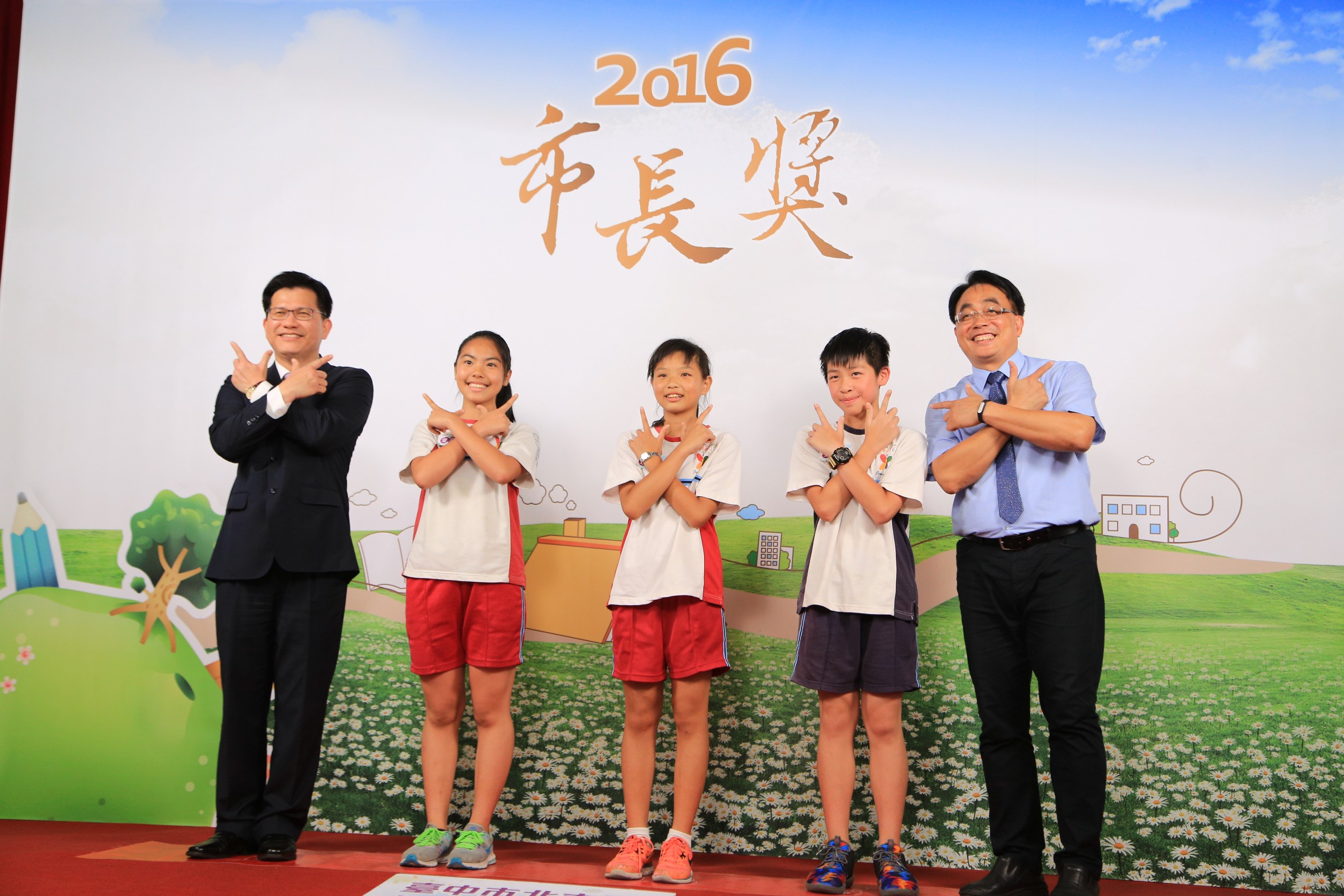 今日畢業生市長獎合影活動,屯區國中小共有1300多位學生出席、市區共有2400多位學生,學生們活潑比出俏皮的「YA !」或愛心手勢,林市長都全力配合;台下學生也熱烈討論要比什麼動作,還有學生說,第一次看到電視外的林市長,直呼「市長好帥!」現場氣氛相當熱鬧。