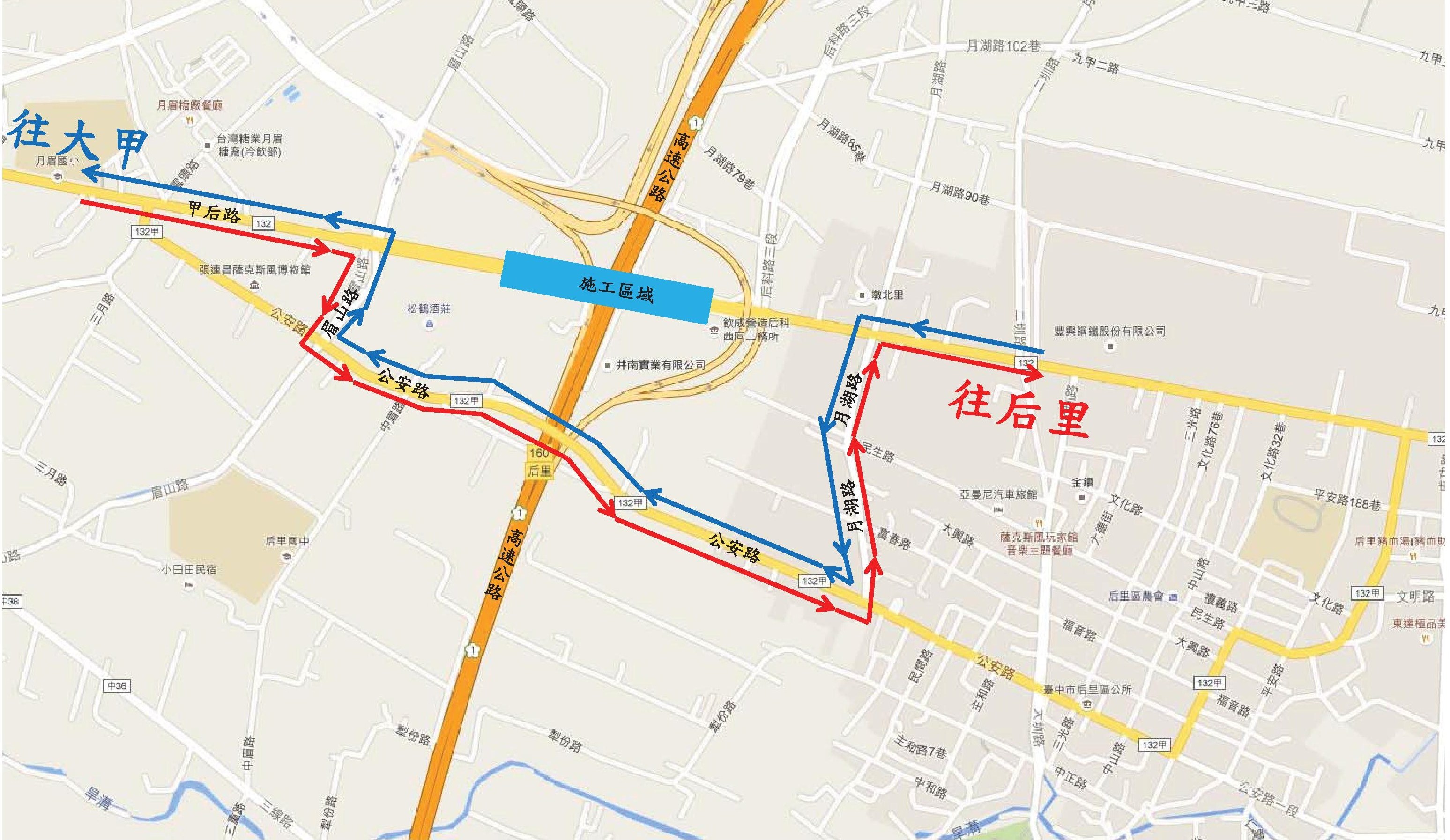 因連日大雨影響,施工期間順延至6月16日至22日,並封閉甲后路自后科路三段至眉山路口,用路人於封閉期間可行駛東行或西行替代道路,東行替代道路往后里方向,可由甲后路、眉山路、公安路、月湖路接往甲后路;西行替代道路往大甲方向,可由甲后路、月湖路、公安路、眉山路接往甲后路通行。(6/20*7)*建設局