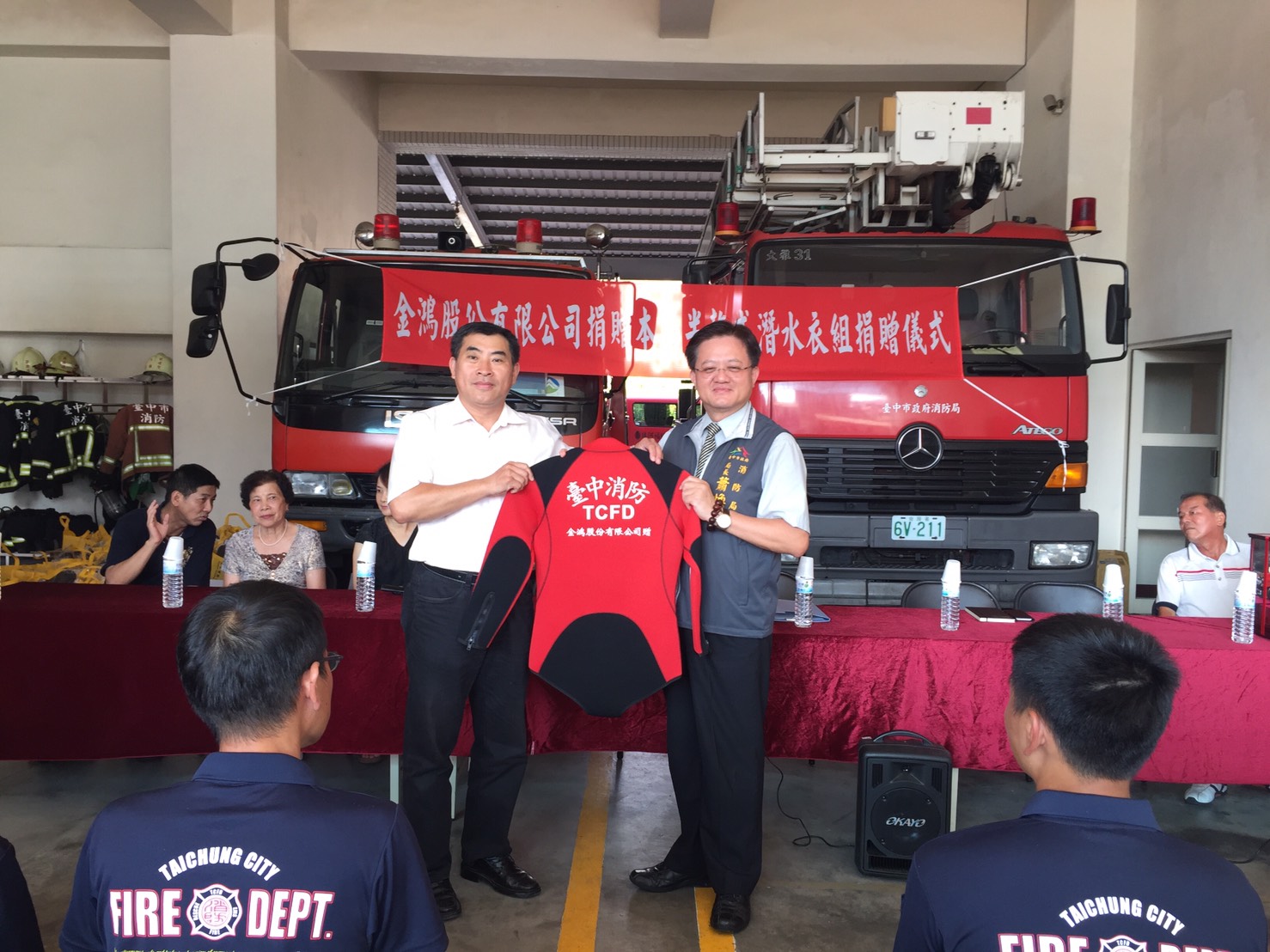 金鴻股份有限公司生產潛水、衝浪、泛舟、游泳及三鐵等項目相關產品,行銷全世界,品質享譽全球。秉持著回饋鄉里的理念,透過消防局潭子義勇消防分隊馬文琳分隊長引薦,捐贈半乾式潛水衣組〈包含半乾式潛水衣、頭套、手套及防滑鞋等〉25組,價值50萬元,適時挹注消防局潛水救溺裝備。