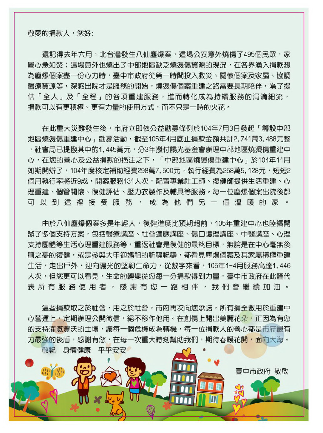 八仙塵爆意外不只燒傷495位民眾,更燒出中部地區缺乏燒燙傷資源的現況,社會局表示,市府從第一時間關懷個案及家屬、協調醫療資源,燒燙傷個案重建之路更需要長期陪伴,在市長林佳龍支持下,市府依公益勸募條例於104年7月發起「籌設中部地區燒燙傷重建中心」勸募活動,截至105年4月底止收到捐款金額共計2,741萬3,488元,委託陽光社會福利基金會於去年11月開辦「中部地區燒燙傷重建中心」。