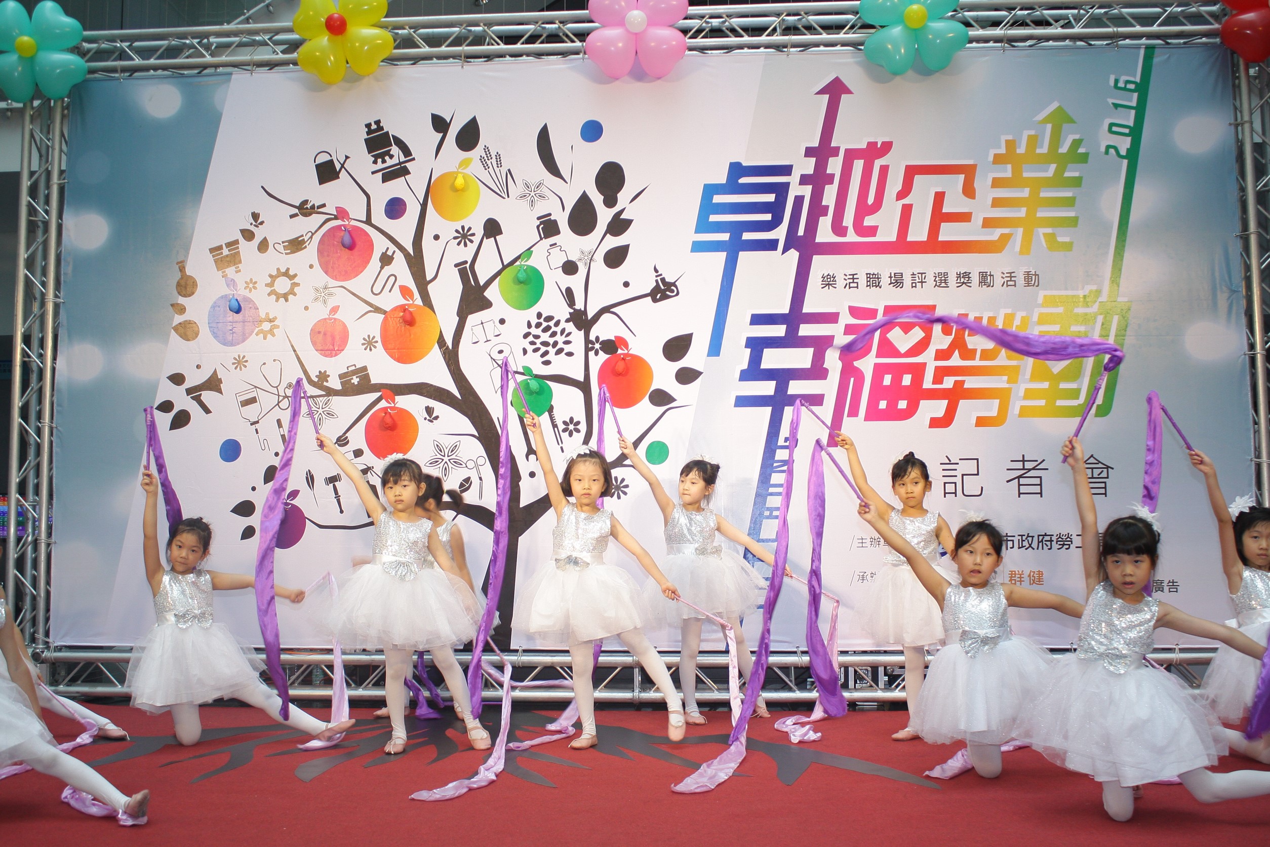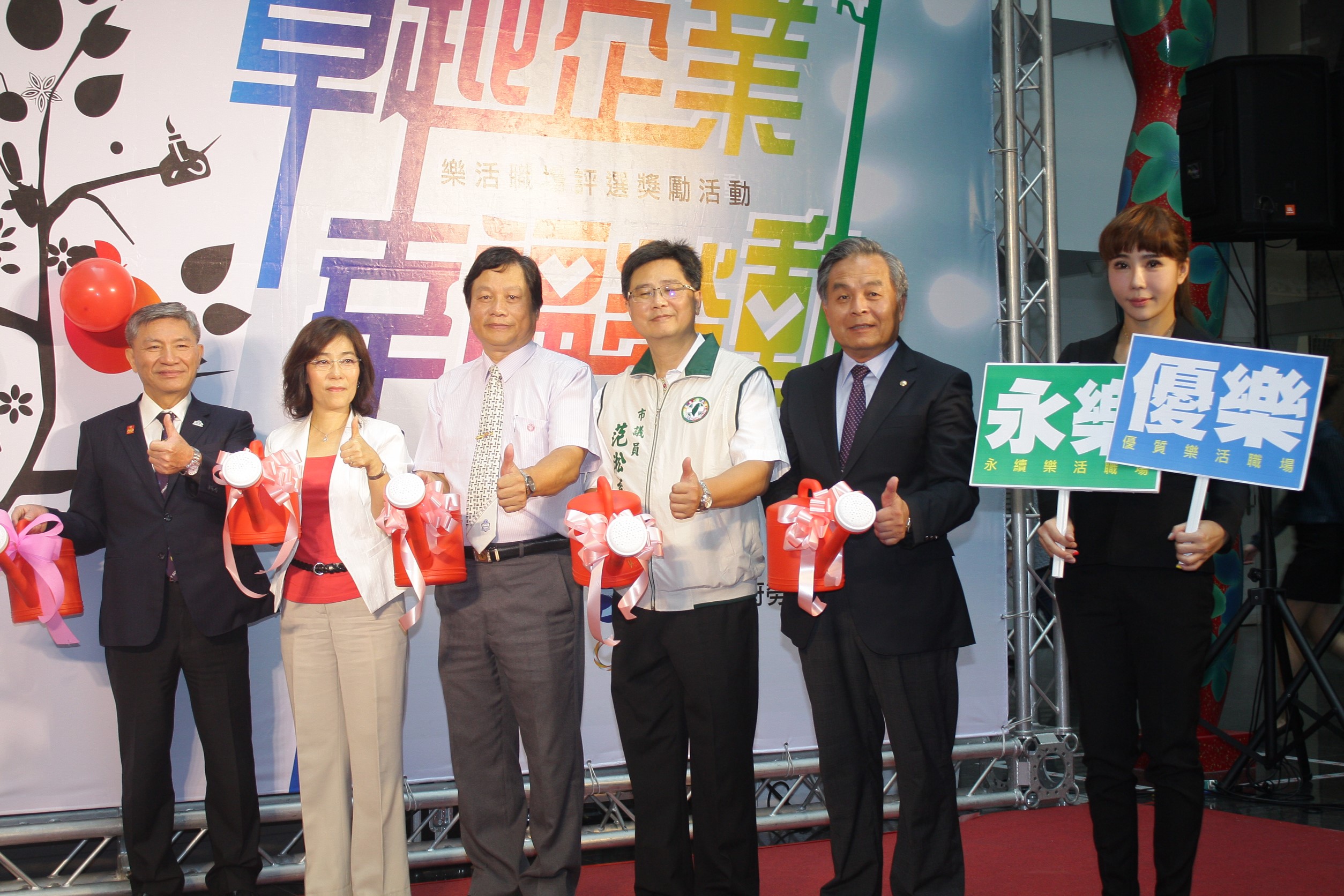 市府勞工局今(29)日於台灣大道市政大樓舉辦「卓越企業、幸福勞動」樂活職場評選獎勵活動記者會,在小朋友可愛純真的舞蹈表演中拉開序幕,接著由副市長張光瑤、勞工局長黃荷婷、市議員范淞育、劉士州、陳成添等人一起灌溉「樂活樹」,象徵「樂活職場」在台中開花結果;最後由連續三年榮獲樂活職場的台灣自來水股份有限公司第四區管理處經理蕭淑貞、山野電機工業股份有限公司副理黃汭琪擔任活動大使,分享參賽經驗、呼籲企業報名參加,提升企業形象。