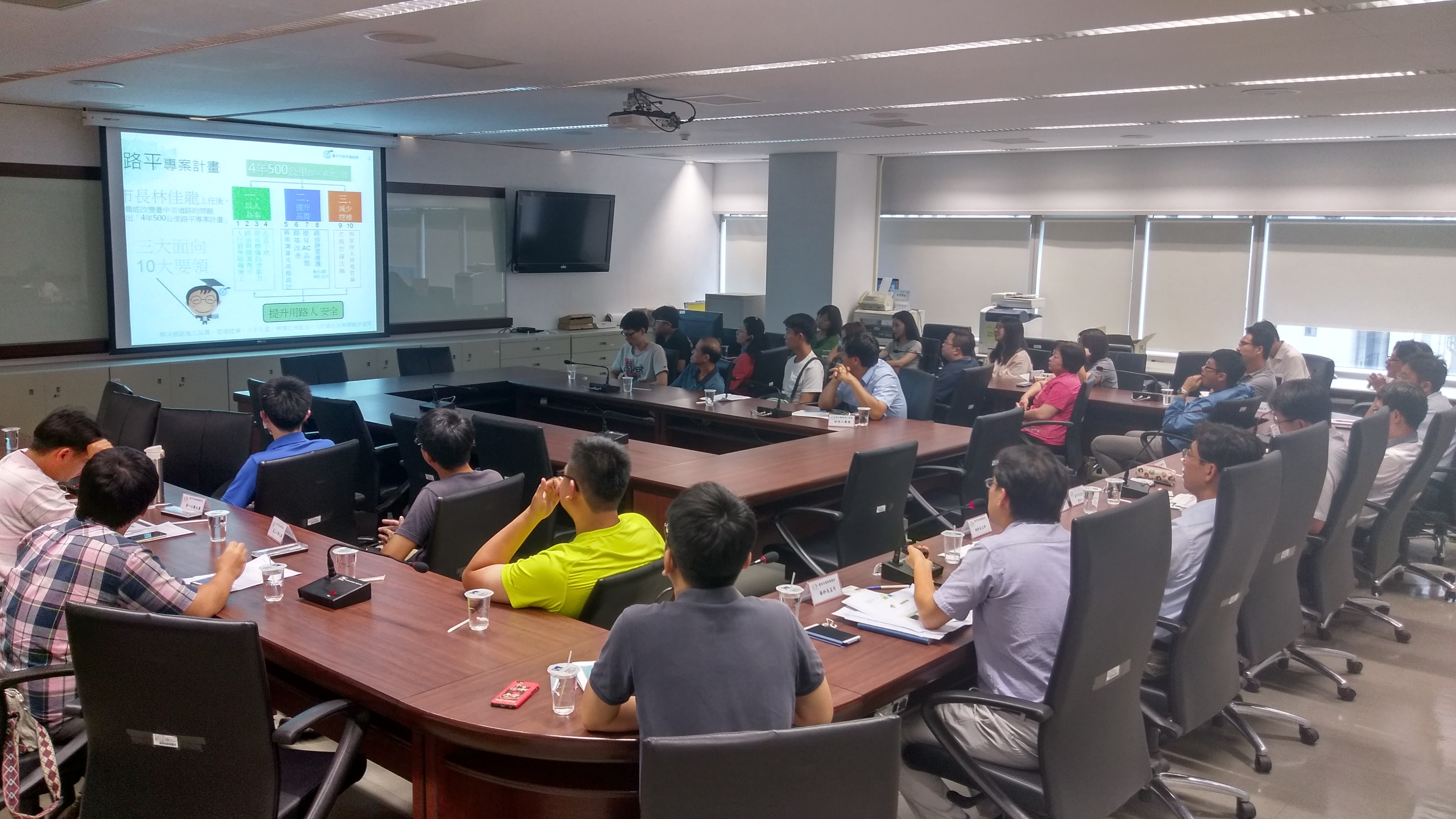 彰化縣政府工務處副處長馬英傑日前率領近20位人員至台中市政府參訪公共設施管線管理與路平成果,並進行座談交流。工務處同仁對於路平前置作業,包括孔蓋下地、建案預留管線、路基改良及路面高程設計等道路改善工程,以及道路養護6小時、統一挖補執行方式、減少挖掘次數制度等等,都熱切詢問,建設局也逐一詳細說明。