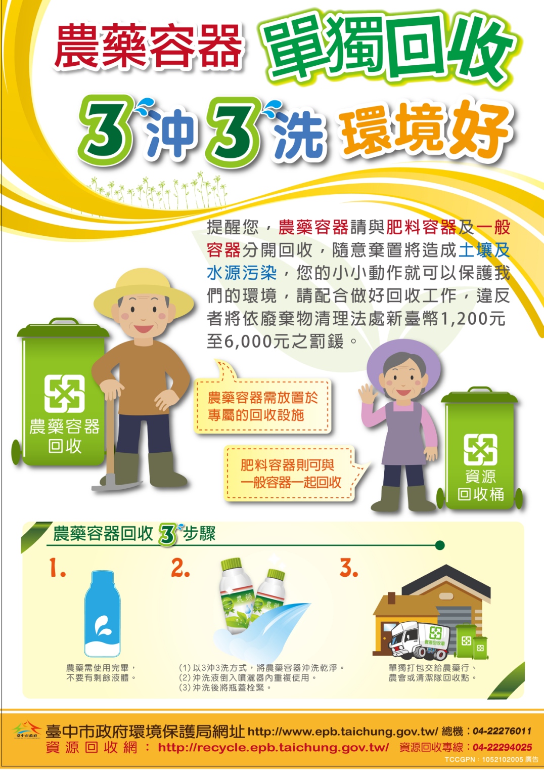 環保局長白智榮表示,大台中耕種地面積達5萬公頃以上,廢農藥容器為常見資源回收物,若任意丟棄可能會汙染環境或危害人體健康。呼籲農友做好「農藥空瓶回收3步驟」,包括:農藥須使用完畢,不要有剩餘液體;蓋緊瓶蓋3沖3洗農藥瓶罐,並將清洗液倒入噴灑器內重複利用;將廢農藥空瓶單獨打包交付清潔隊或農會回收點回收。