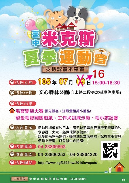 毛孩子的爸爸媽媽看過來!想趁著假日午後的悠閒時光陪伴家中毛小孩出遊或計畫認養可愛犬貓的朋友們有福囉!「105台中米克斯夏季運動會」週六(16日)在文心森林公園熱鬧展開,歡迎大家帶著毛寶貝一同健走挑戰寵愛毛寶闖三關活動,還有犬隻10米障礙賽、默契大考驗及123木頭人等歡樂小互動,更有寵物3D拍照景點及免費美照拍貼機,提供您與毛小孩共同留下充滿各種有趣合照,快來感受夏季運動會毛小孩熱情的活力吧!詳細資訊請見http://bit.ly/29FHCsr 。