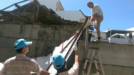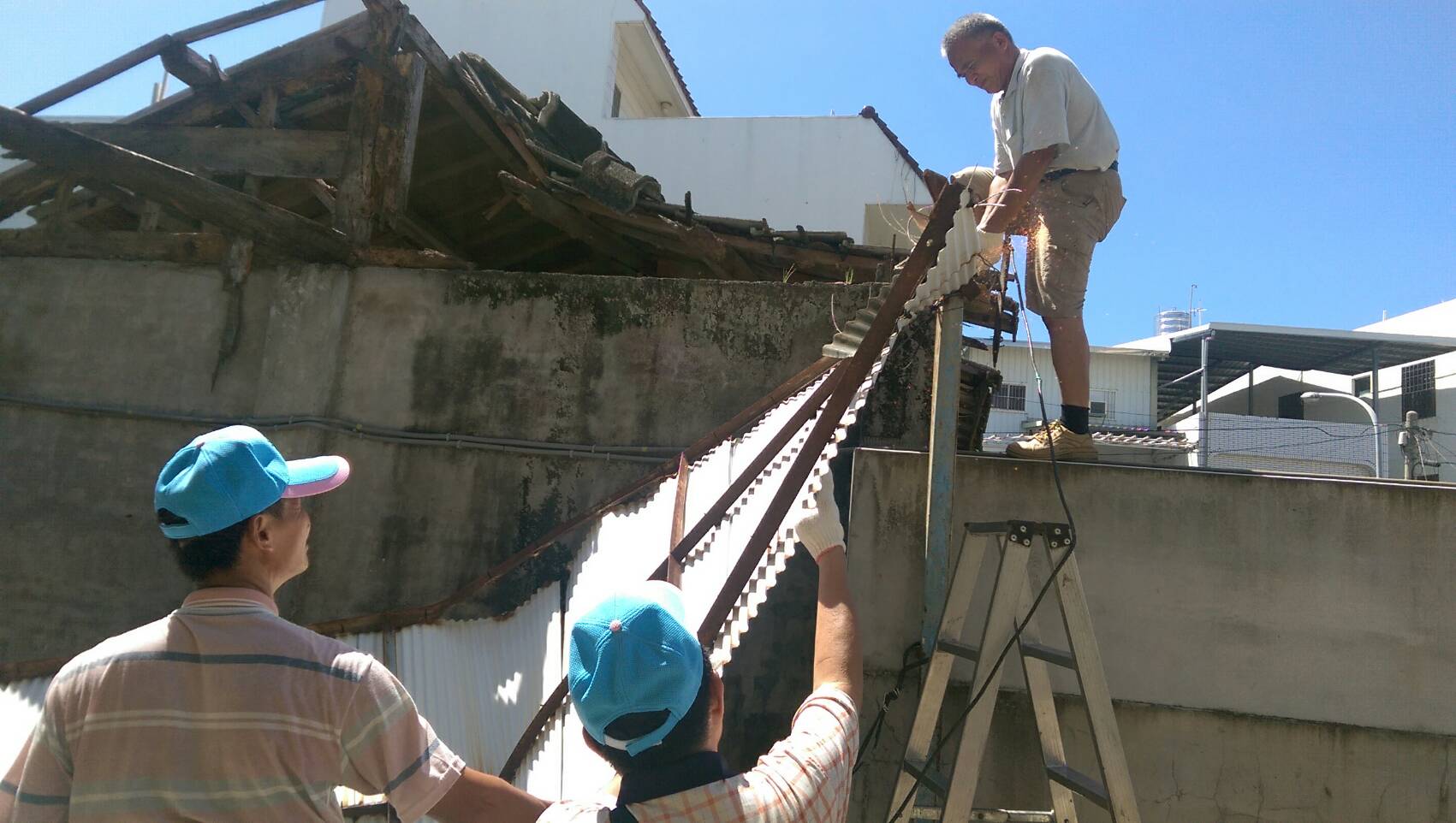 因此,勞工局長黃荷婷協調相關工會,調度7名鐵工技術人員、8名水電師傅及單臂吊車1台,由台中市總工會理事長陳金源、鐵工業職業工會理事長莊銘旭、水電工會理事長黃穎駿率隊前往台東協助重建。
