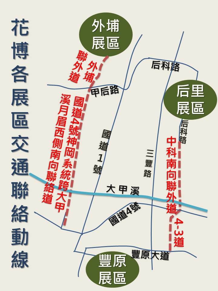地政局表示,市府將於花博期間規劃配套聯外道路,以舒緩觀展車潮。由豐原葫蘆墩公園展區至后里展區,可沿豐原大道六段北上,再由4-3號道路接中科南向聯外道路,跨越大甲溪接后科路即可抵達。到外埔展區則可由后科路經甲后路抵達;或行駛國道4號神岡系統道,跨大甲溪月眉西側南向聯絡道,再銜接外埔園區聯外道路直達。(7/19*18)*地政局