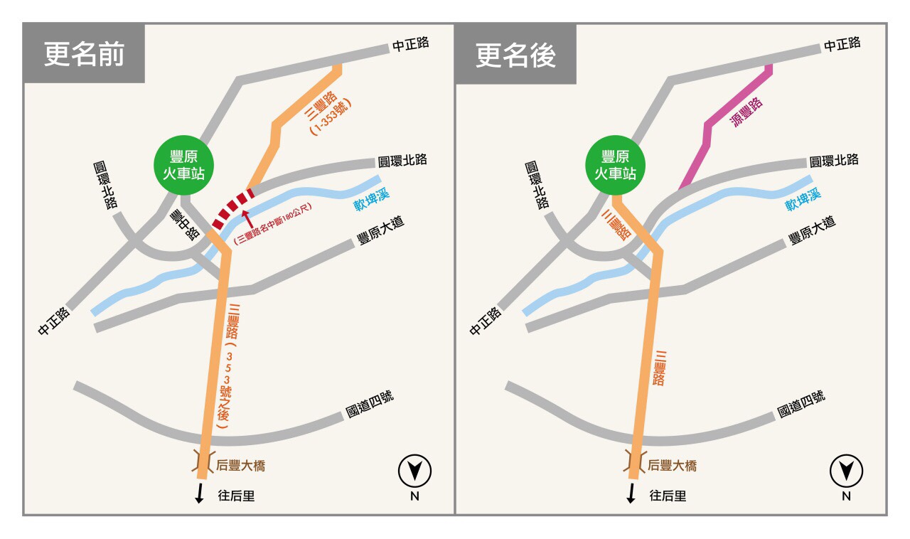 而從豐原火車站往圓環北路的豐中路,地理上與三豐路連成一線,因此,為解決30年來的老問題,民政局依據《台中市道路命名及門牌整編實施計畫》辦理兩條道路重新命名公告,並於地方召開協調會,邀請在地里長、里民出席;經討論後,三豐路1至353號更名「源豐路」,豐中路則更名為「三豐路一段」,由豐原區戶政事務所送市府核定後,目前門牌整編訂於8月1日生效,新的交通指標也已製作並懸掛完成。