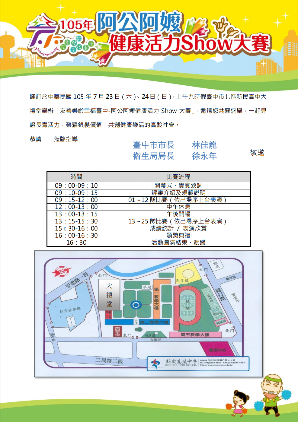 105年友善樂齡‧幸福臺中-阿公阿嬤健康活力show大賽,7月23、24日(星期六、日) 9時在新民高中大禮堂舉辦「阿公阿嬤健康活力Show大賽」,將近2,000多位阿公、阿嬤在舞臺上扭腰擺臀,歡迎攜家帶眷前往觀賞,共同體驗長者的動感活力!