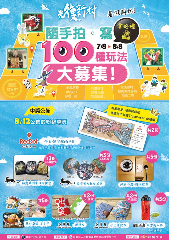 暑假開跑,快來霧峰『光復新村』規劃個適合情人約會、親子闔家共遊及三五好友結伴遊玩的文青小旅行吧,即日起至8月8日止,參加光復新村100種玩法大募集,把您的私藏玩法大公開,還可以抽好禮,快快把握機會喔!