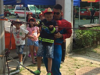 活動安排消防安全介紹,向學童宣導主動裝設住宅用火災警報器、防範一氧化碳中毒等防災觀念,並讓孩子設計專屬於自己的家庭消防護照;現場也有體能競技闖關活動,參賽者答對題目即可獲得消防宣導品,活動結束後還可和超級英雄拍照留念。