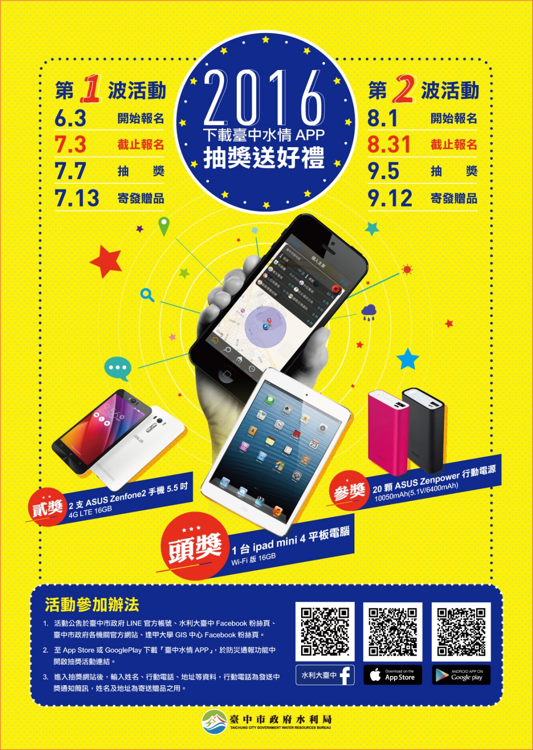台中水情APP第二波抽獎活動開跑,只要先至Facebook搜尋「水利大台中」按讚及分享活動,再利用APP Store或Google Play下載「台中水情APP」,於「防災通報」填寫基本聯絡方式,即可參加抽獎活動,獎品包含ipad mini 4平板電腦與ASUS Zenfone2手機等大獎,市府水利局歡迎民眾踴躍參加。