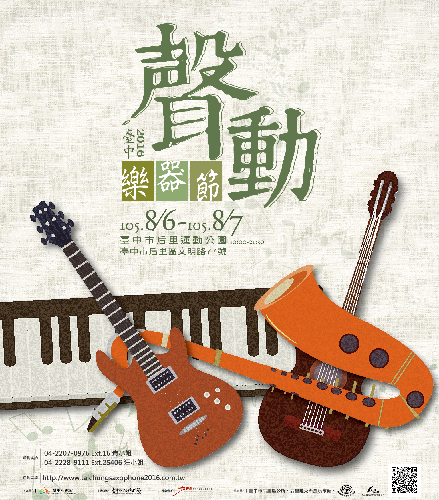 台中樂器節,聲動大台中!一年一度的「台中樂器節」,將於本週末在后里運動公園熱鬧登場,邀請葛萊美獎得主Wayne Escoffery及國內優秀團隊演出,也祭出總額新台幣30萬元獎金挖掘新秀樂手,活動從早到晚不間斷,讓悠揚樂聲與您歡渡週末;七夕情人節將至,週末兩天在石岡食水嵙休閒農業區情人木橋及石岡農會穀倉,將有「梨饗情人愛七桃 悠遊石岡套真愛」系列活動,除有梨果農特產品展售會、限量醃桃DIY活動外,還有樂團演奏情歌,一起來熱鬧一夏吧!