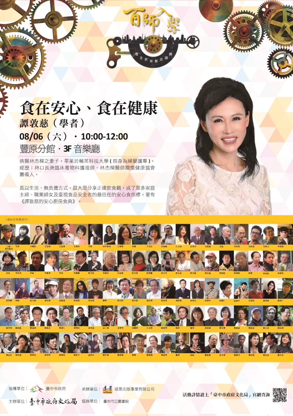 「俠醫」林杰樑之妻、也是林口長庚紀念醫院臨床毒物科護理師譚敦慈,週六(6日)上午10時將在台中市立圖書館豐原分館開講,細說食品安全與分享解毒秘方,分享正確飲食觀,帶領大家一起知毒、避毒、解毒,了解正確飲食概念與排毒方式,食得更加安心健康。相關場次資訊可至活動網站(http://bit.ly/2949WRT )瀏覽查詢。本週還有不少展覽、演講等活動,更多活動資訊,請見「中市週末活動看板0806_0807」。(8/5*6)*新聞局