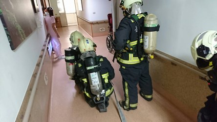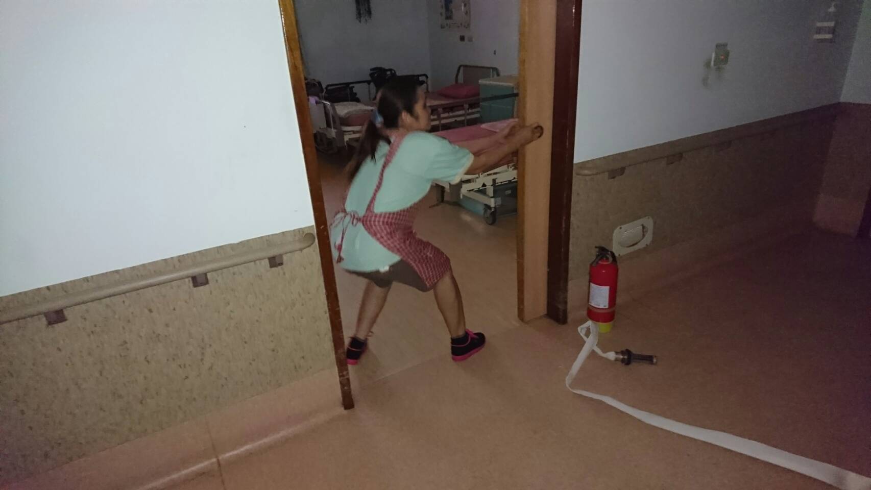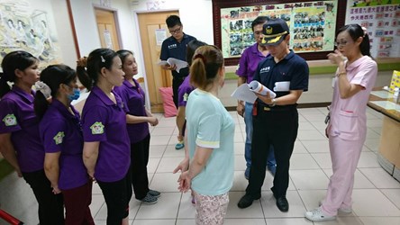 演練狀況模擬護理之家7樓發生火災,場所收容行動不便長者待撤離,九德大愛養護中心立即啟動自衛消防編組,實施疏散及避難,當天照護人員關閉防火門以阻隔火勢等待救援。