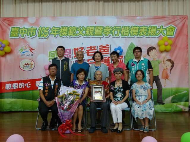 社會局表示,今年接受表揚的模範父親中,烏日區的吳振發先生擔任公務員時奉公廉潔、為民服務,44歲時因妻子病逝,吳先生父代母職、拉拔四個孩子長大,如今孩子們都各有成就,吳先生的付出值得感佩。