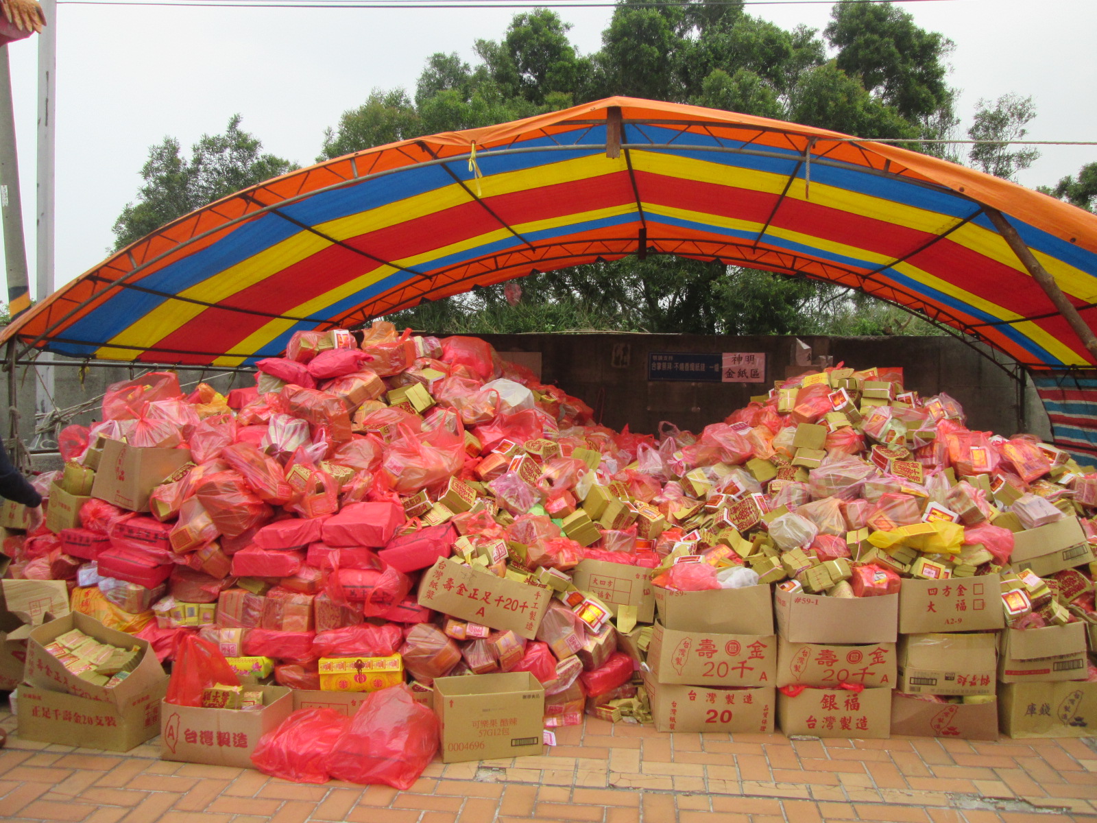 農曆7月到,宮廟、納骨塔紛紛舉辦法會燃燒紙錢,台中市政府環保局積極推動「以功代金不燒金」環保祭祀政策,宣導將購買紙錢預算捐贈弱勢團體,去年度紙錢集中清運量2,661.4公噸、推廣一爐一香共減少約24億支香、以功代金達65萬7,900元、以米代金達1,931包,減少PM2.5汙染物3,820.3公斤,成果豐碩。呼籲市民持續配合,減緩空汙也幫助弱勢朋友。