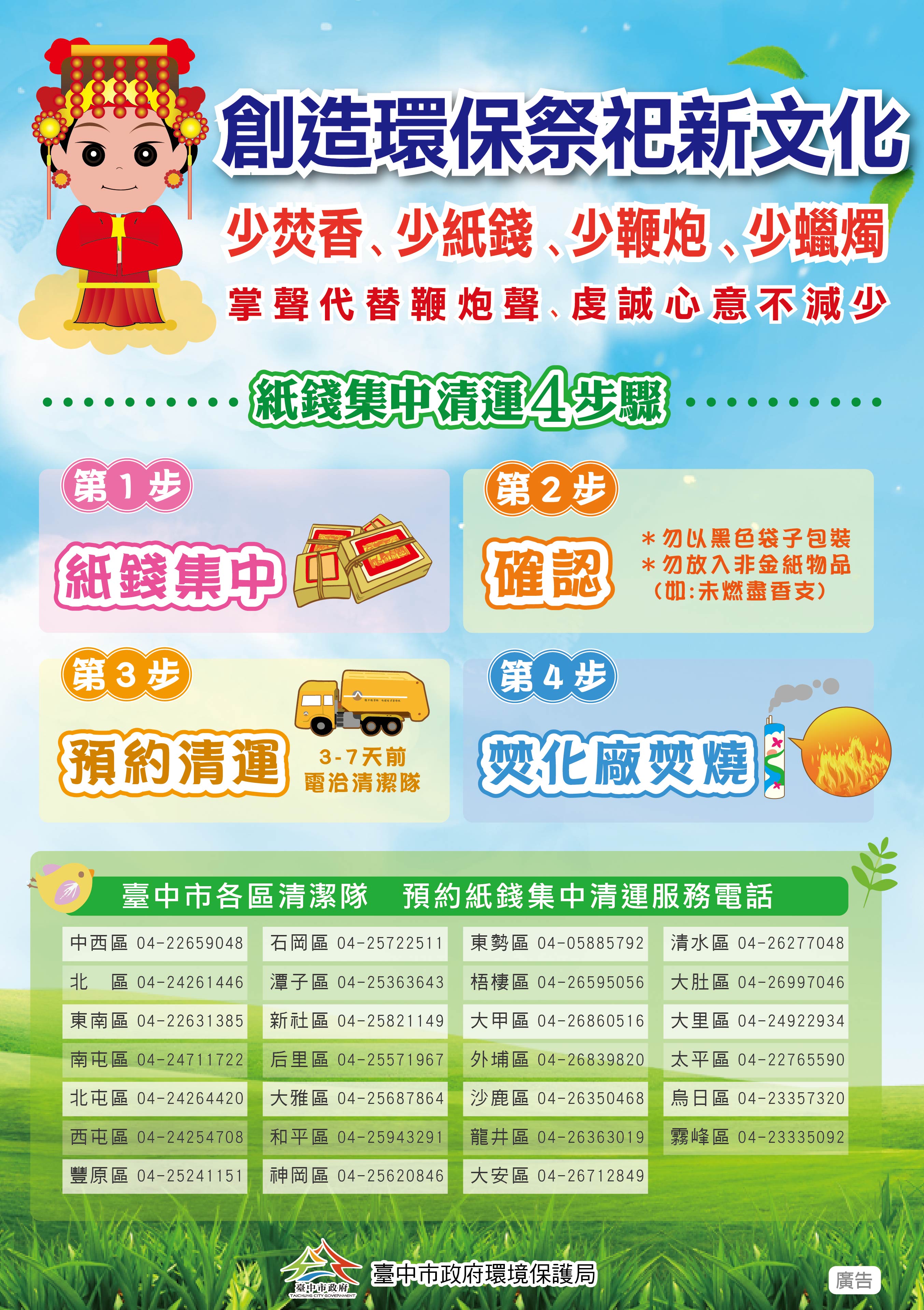 環保局指出,為便利市民集中清運紙錢,清潔隊將派清運專車到指定地點免費服務,民眾可撥電話聯繫各區清潔隊,或至環保局紙錢減量資訊網線上預約 http://temple.epb.taichung.gov.tw 。 (8/7*10)*環境保護局
