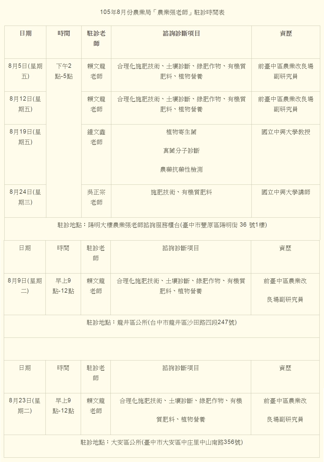 為協助農民克服栽培及經營上的困境,台中市政府農業局去年起在豐原陽明市政大樓設置「農業張老師」聯合服務窗口,為讓海線農民也能就近接受服務,8月9日及8月23日將分別前往龍井區公所及大安區公所巡迴駐診,歡迎有需求的農友多加利用。