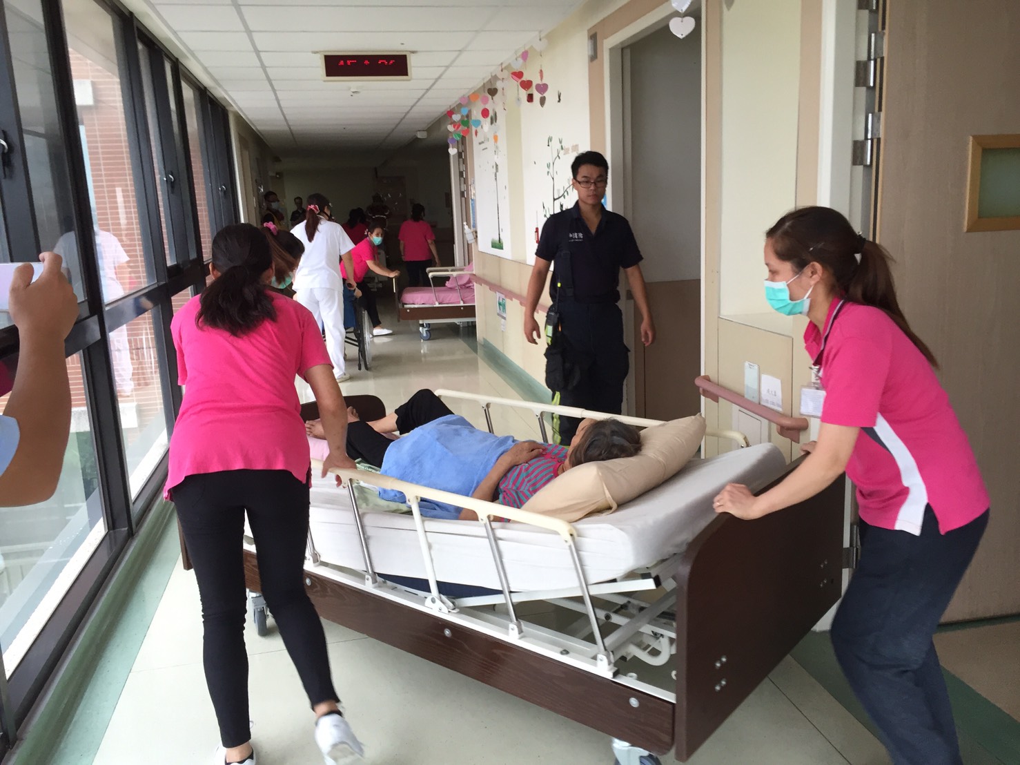永康護理之家為地上6樓,地下一樓之安養院,目前收容149位長者,收容對象包含臥病在床、行動不便及插管的長者。演練假想護理之家五樓的一間病房電線起火,護理之家自衛消防編組啟動,初步使用滅火器及室內消防栓滅火無效,將起火層病床移至防火區劃內,非起火層則就地關門避難,等待消防局人員到場後接手。