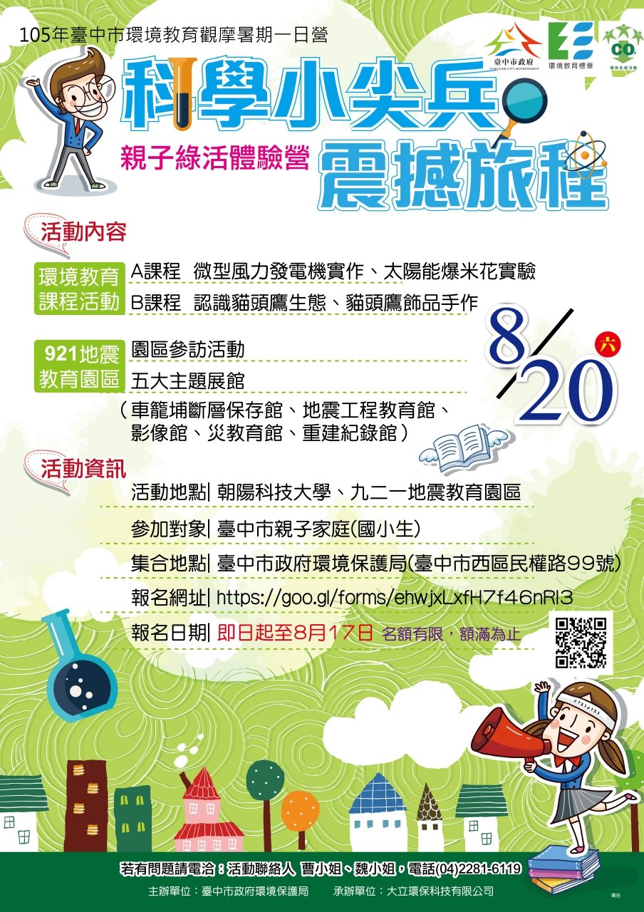 為培養友善環境理念,台中市政府環保局8月20日在朝陽科技大學及921地震教育園區舉辦舉辦「科學小尖兵 震撼旅程」親子綠活體驗營,包含「微型風力發電機實作」、「認識貓頭鷹生態」、「貓頭鷹飾品手作」及「921地震教育園區參訪」等課程,全程免費,歡迎報名參加。
