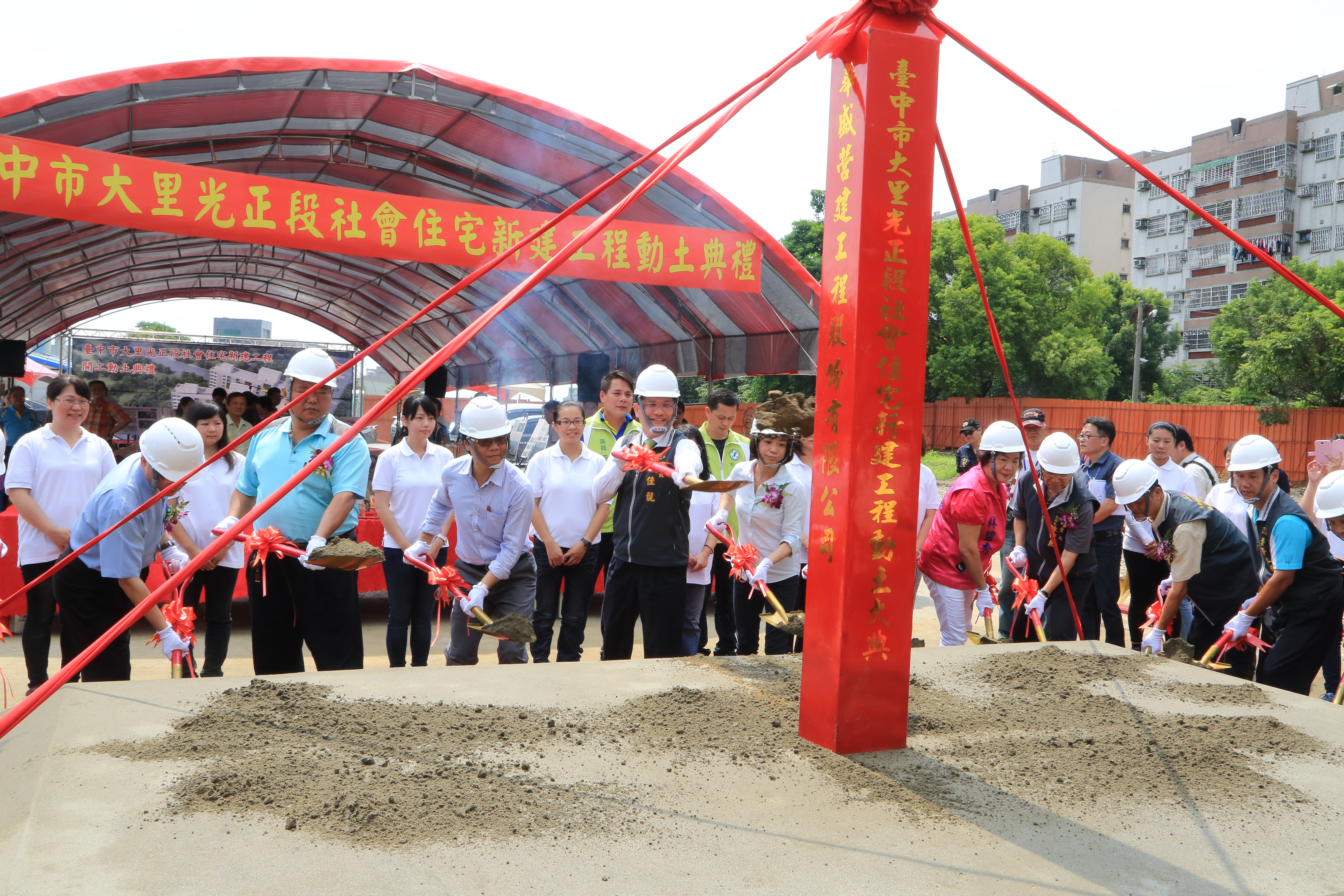 台中市政府都市發展局今日舉辦大里光正段社會住宅動土典禮,包括林市長、立法委員何欣純、內政部長葉俊榮、內政部營建署長許文龍、市議員林碧秀、張滄沂、蘇柏興、市府都發局長王俊傑等人均出席參加,共同祈求工程順利圓滿。