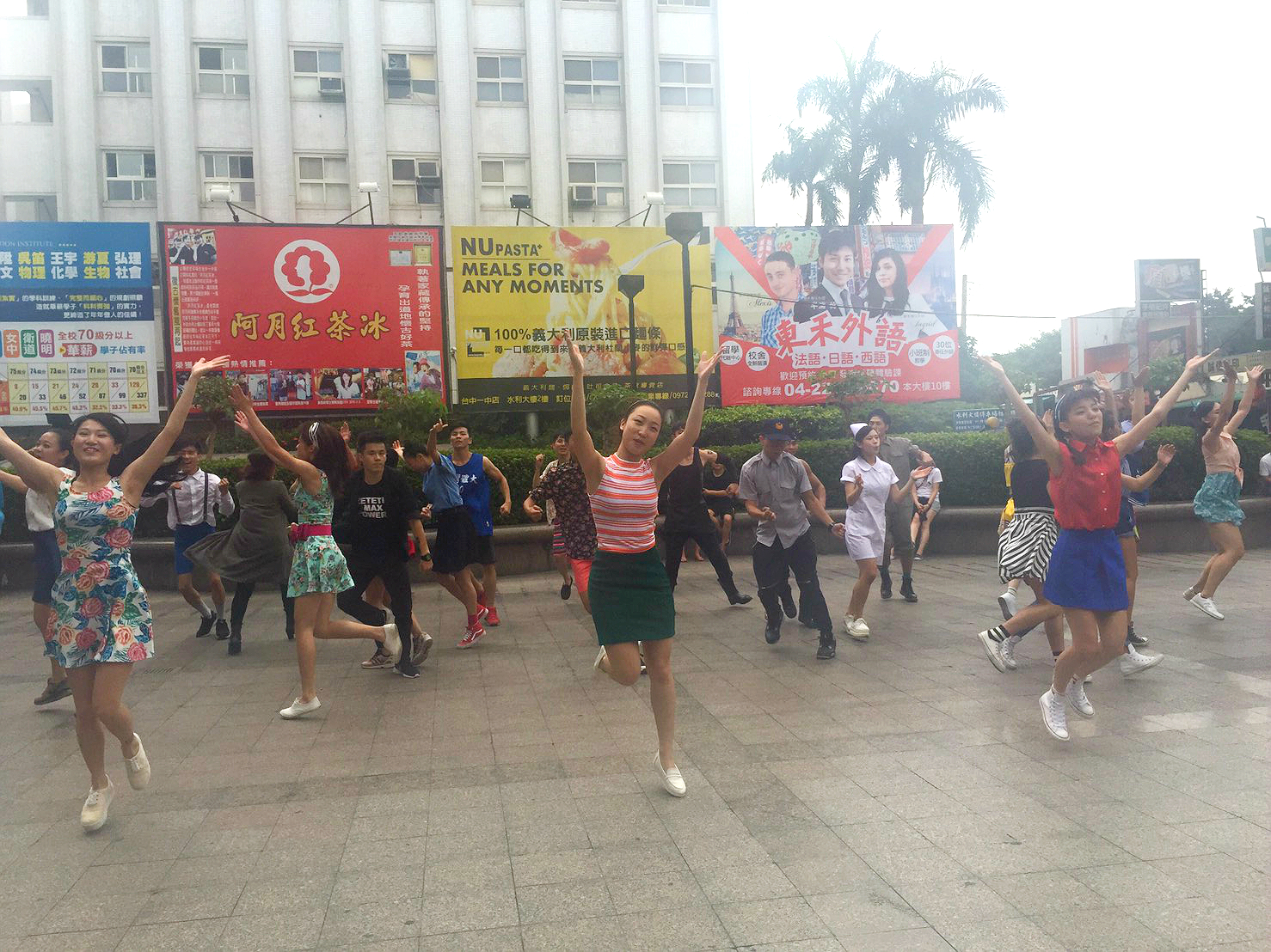 台中市政府觀光旅遊局將於9月15日至18日在台灣大道市政大樓府前廣場及夏綠地公園周邊舉辦「台中國際踩舞祭」,邀請全台12所高中大專院校及日本表演團隊進行舞蹈踩街展演;為宣傳踩舞祭,觀光旅遊局號召台灣體育大學學生今(21)日中午在一中水利大樓前進行快閃舞蹈表演,吸引眾多人潮聚集觀賞。