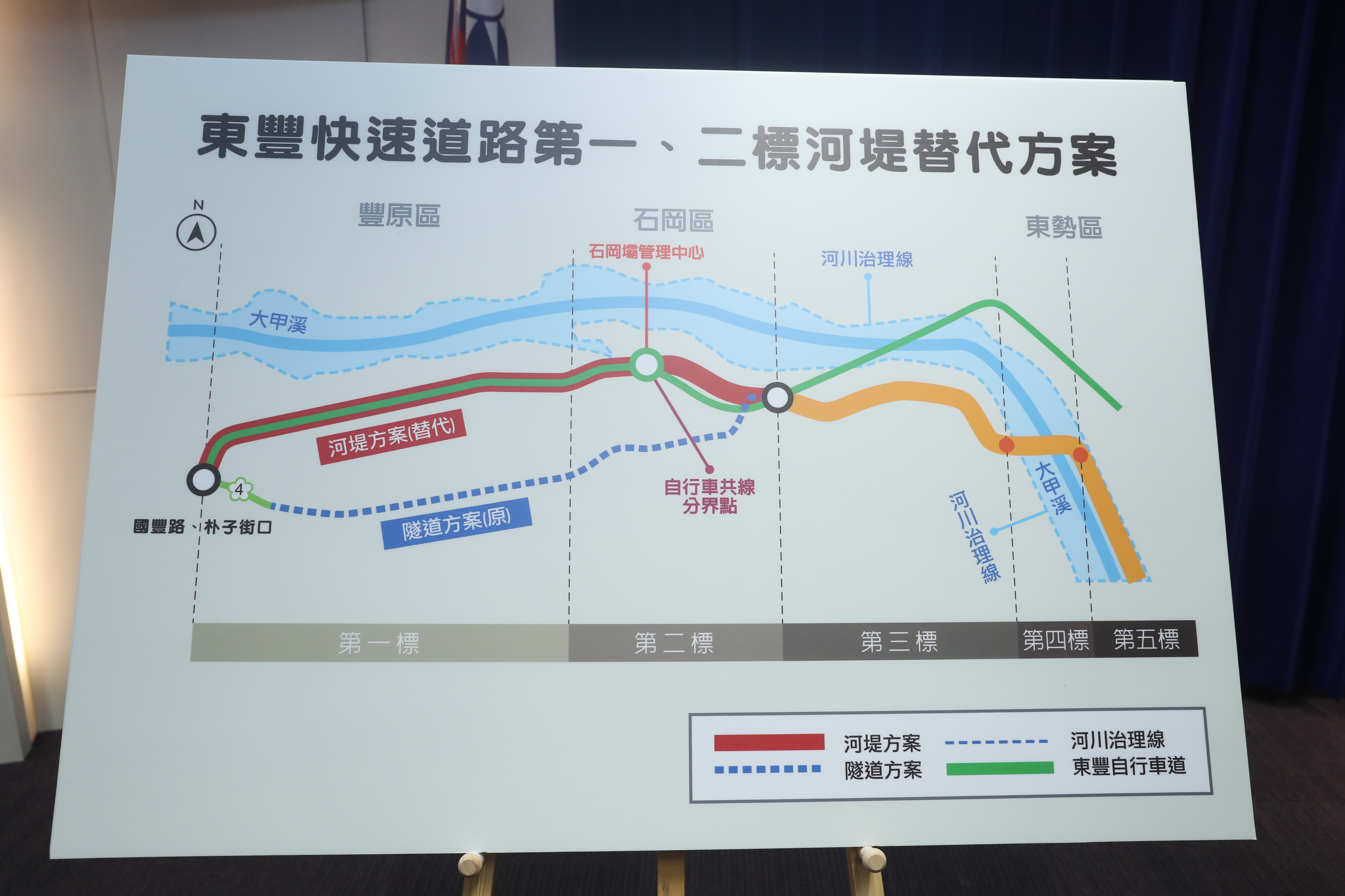 「東勢豐原生活圈快速道路」(簡稱「東豐快」)原方案的第1、2標工程,規劃在石岡地區採隧道工程,但因地質安全等因素引發爭議。有鑑於當地居民長久以來備受交通不便之苦,市府積極研商兼顧安全及便捷的可行方案,經審慎檢討,綜合多次專案會議評估後,於今日舉辦的「東勢豐原生活圈快速道路第1、2標進度說明記者會」上,提出「河堤方案」替代路線,不僅化解爭議,更可望結合自行車觀光休憩產業。