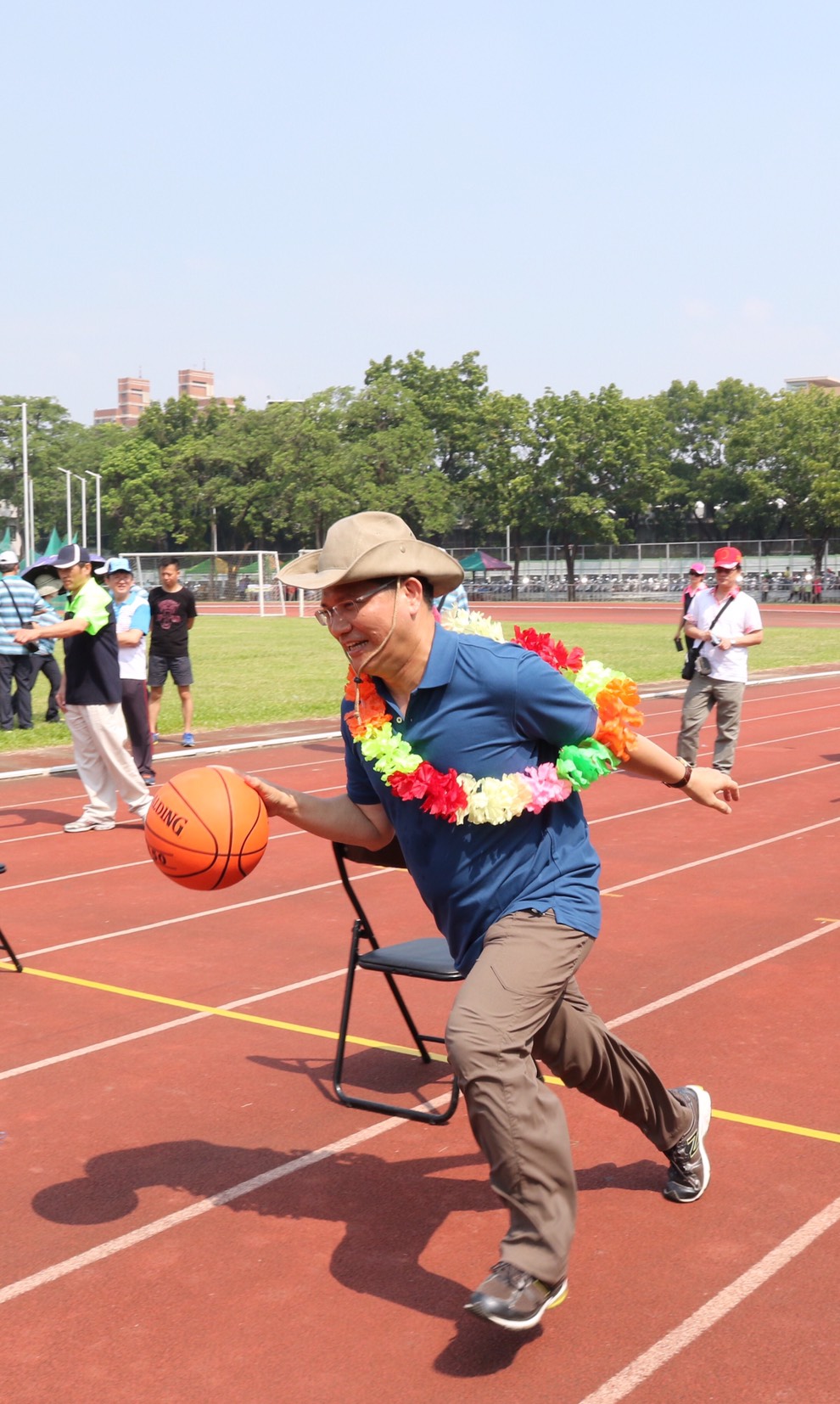隨後,林市長參加「龍騰虎躍」趣味競賽,透過單手運球在10公尺處放置花環,並於20公尺處放上高帽,最後折返衝回起點,全力以赴獲得好成績。