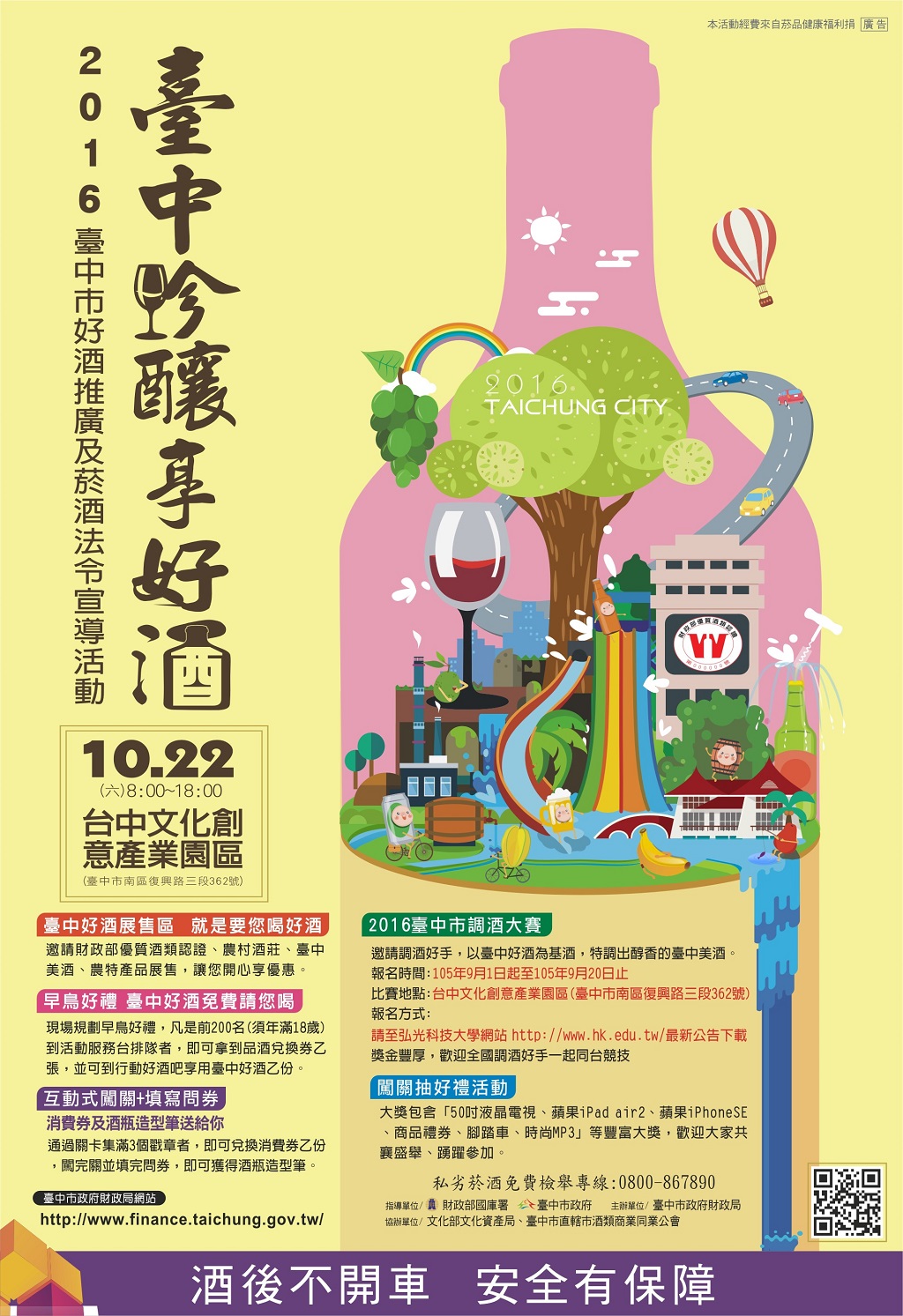 台中市政府與民間製酒業者共同努力提升好酒文化,推廣在地好酒,連續6年舉辦調酒大賽,邀全國調酒好手踴躍參賽、切磋技藝並激發創意,歡迎民眾踴躍到場為選手加油,也品嚐台中市好酒及瞭解消費菸酒權益。