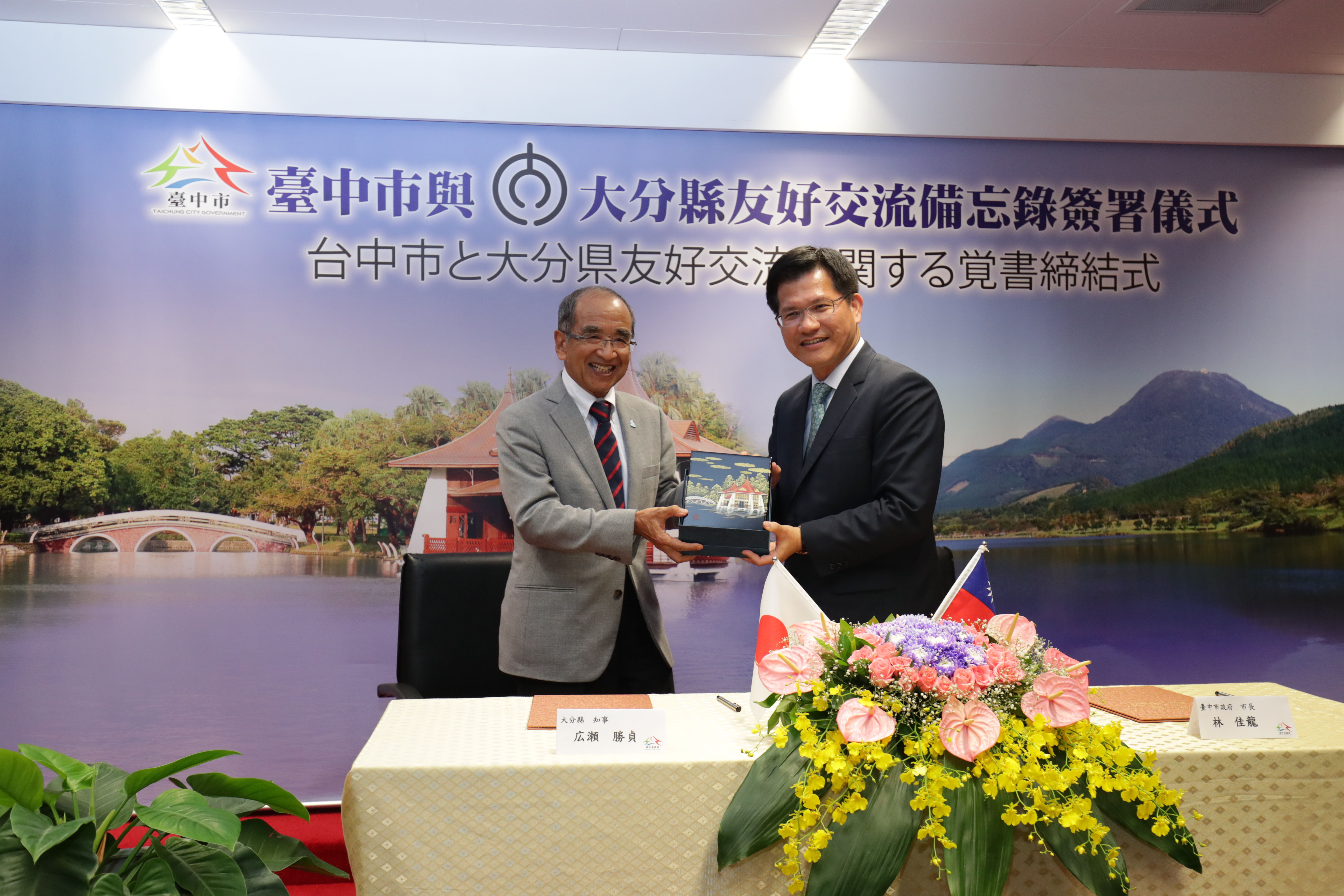 市長林佳龍今(8)日與日本大分縣知事廣瀬勝貞簽署「兩地友好交流備忘錄」(MOU),未來將積極促進體育、農業、教育、產業等領域交流與合作,台中市將與「日本第一溫泉縣」大分縣共搭友誼橋梁,開創台日交流新局面,而兩市的定期航班也將於9月15日正式啟航。