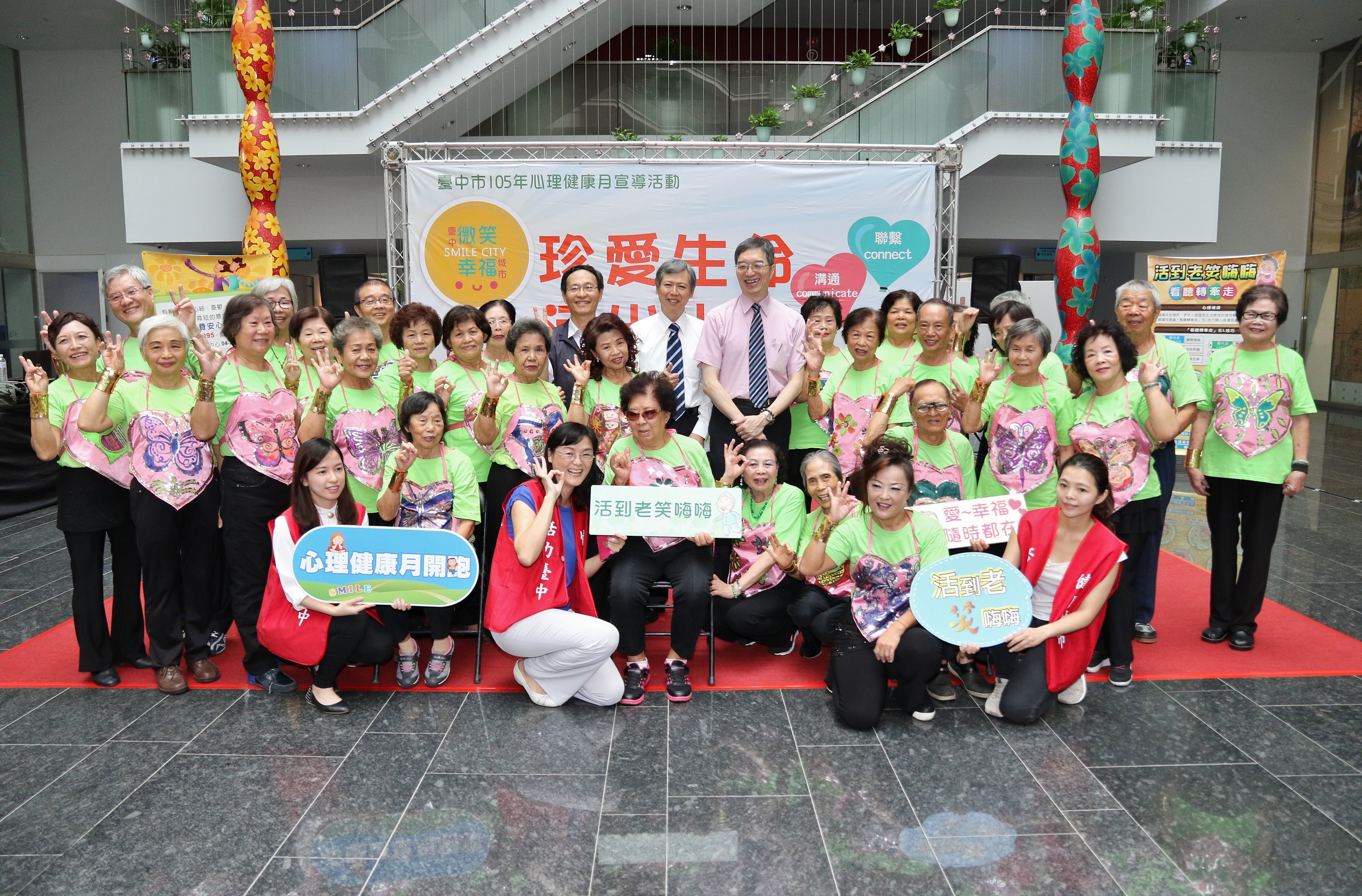今日活動由平均年齡75歲的北屯區仁愛社區發展協會「愛水活力隊」阿公阿嬤帶來的活潑舞蹈拉開序幕,並由副市長林依瑩、副祕書長李賢義、衛生局副局長陳南松、衛生福利部心理及口腔健康司長諶立中及台中市心理健康專家代表等人,共同宣示將運用聯繫(connect)、溝通(communicate)、關懷(care)三大要素,與周遭人們建立連結,形成支持網絡。